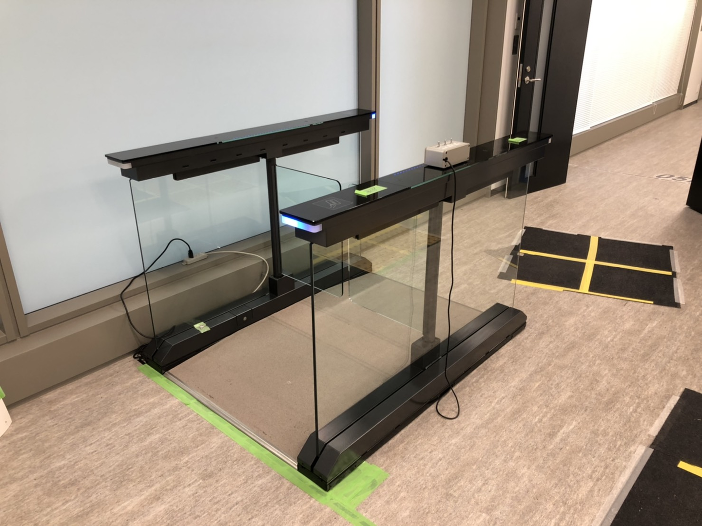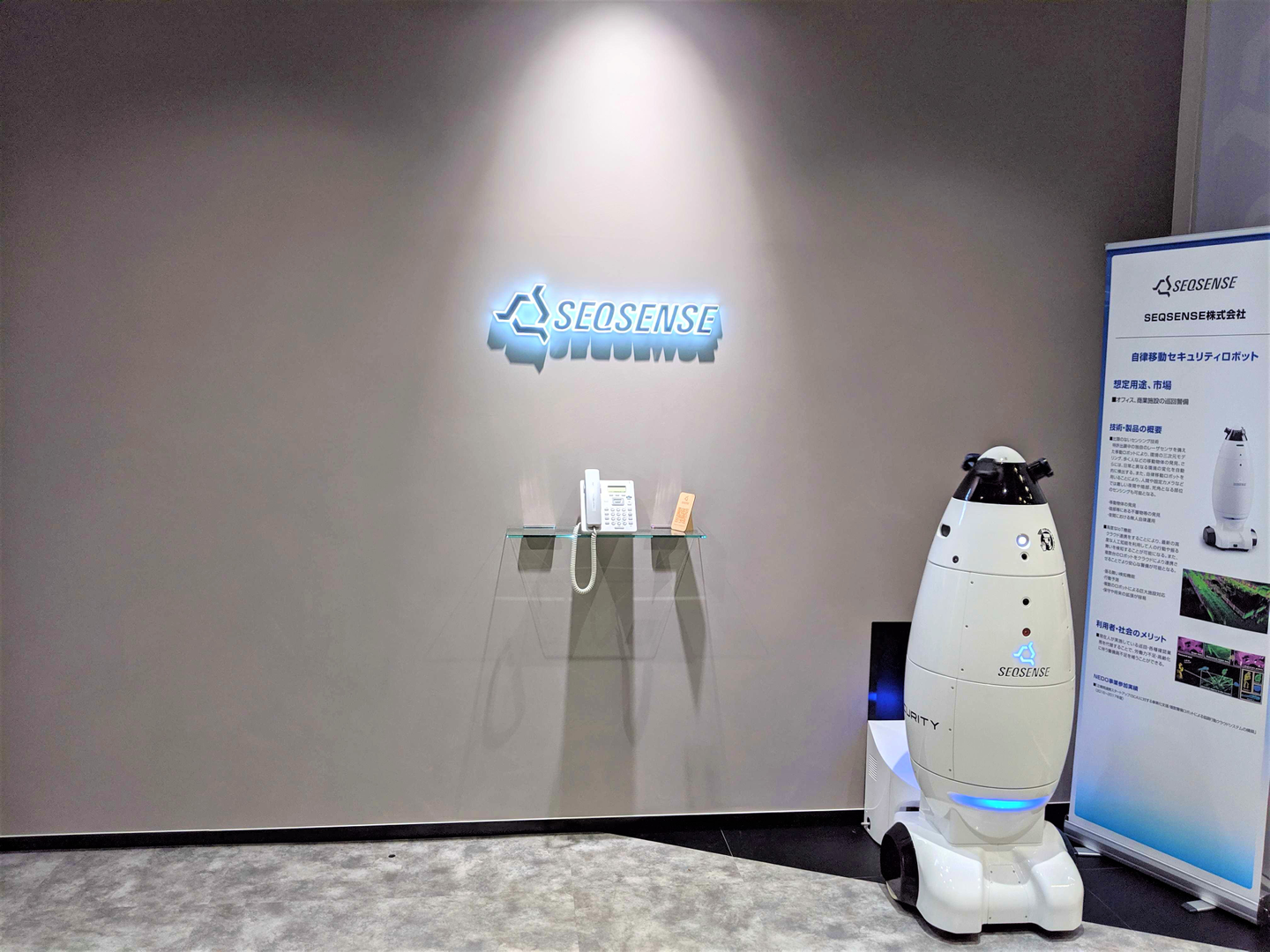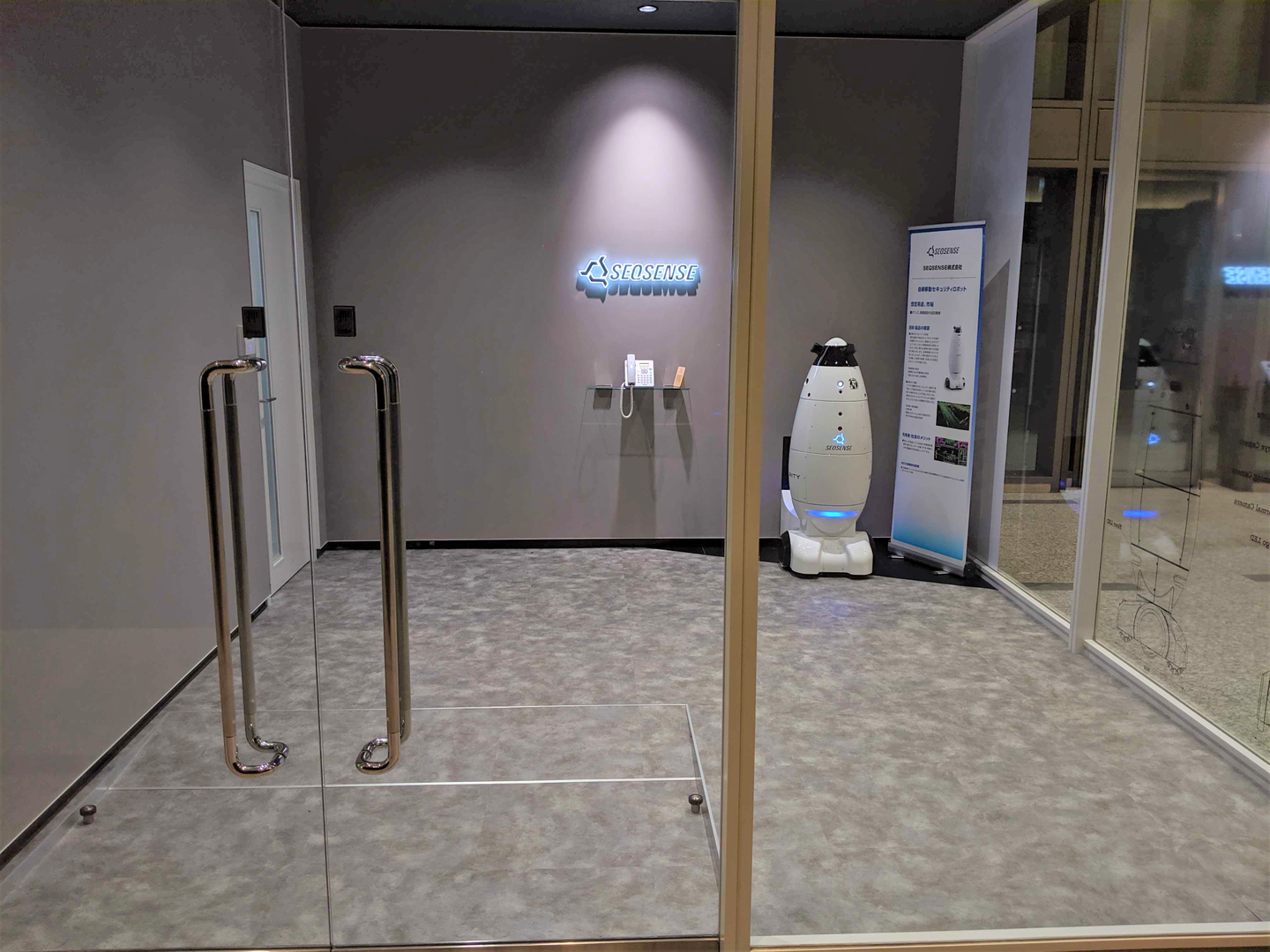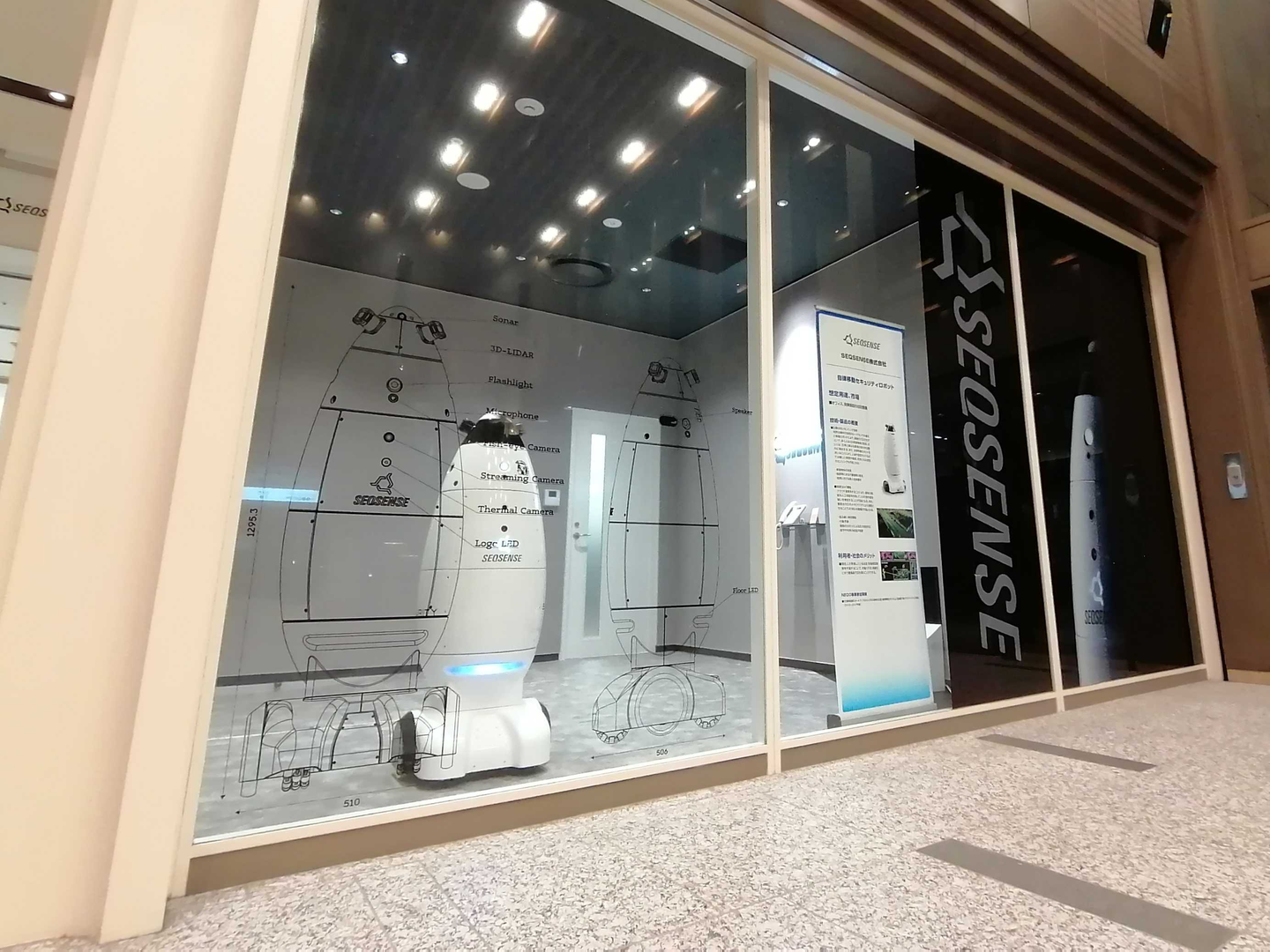 ▼エントランスに入ると自律移動セキュリティロボットの機能説明のパネルと充電ステーションがあります。