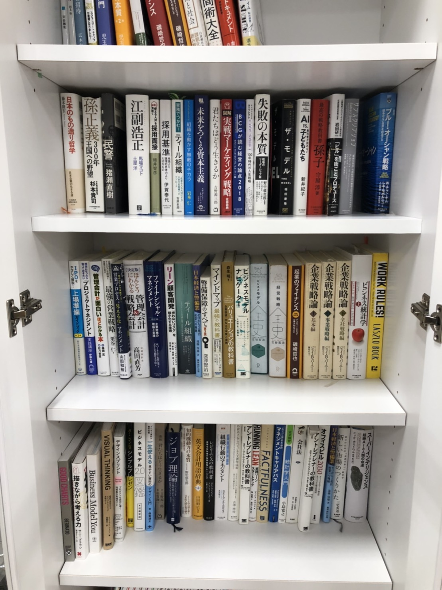 ▼こちらは本棚になります。弊社には書籍購入制度があり、幅広い内容の本が社内で共有されています。