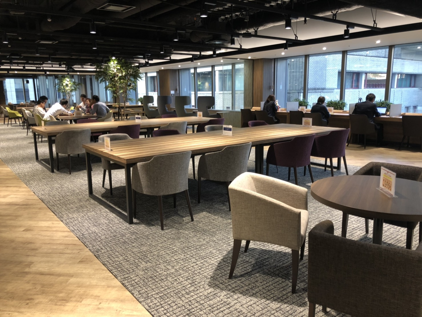 ここまではオフィスの中の様子をご案内してきましたが、これから弊社の入居している日比谷国際ビルの共有スペース(8階)のご紹介をしたいと思います。社内で集中できない時はこちらのスペースに移動して業務をすることが可能です。弊社エンジニアからは非常に好評で、自分のペースでうまく時間をコントロールしながら集中できる環境が整っています。