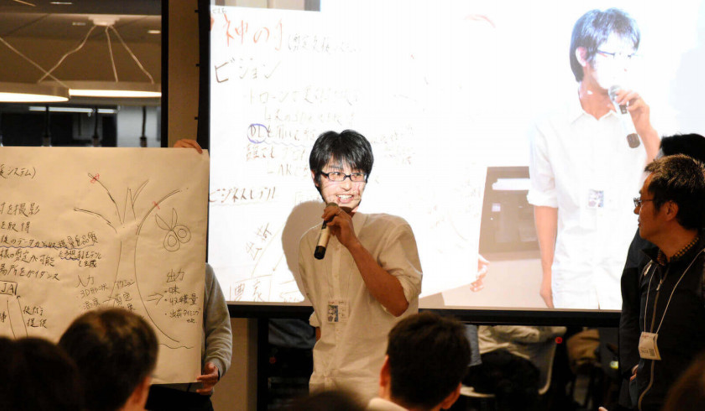 が受賞。素人でも玄人が剪定したデータを活用することで玄人と同じレベルで剪定できるよう支援するというアイディアです。後継者不足という農家が抱える課題に応えるアイディアであり、実現可能性が高いという点が評価されました。