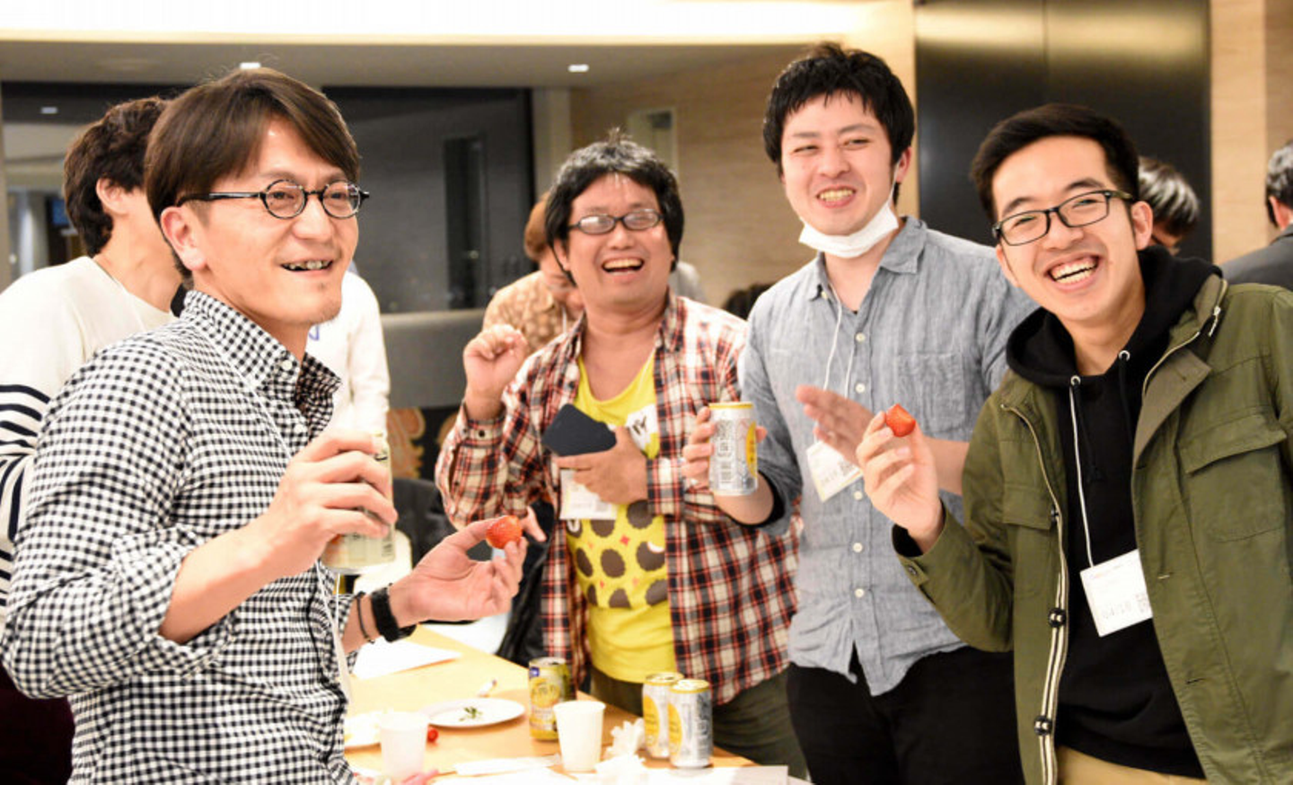 懇親会では早い者勝ちで加藤農園のいちごとコンフィチュールが振舞われ、あまりの甘さ、みずみずしさ、匂いの良さに歓声があがりました。