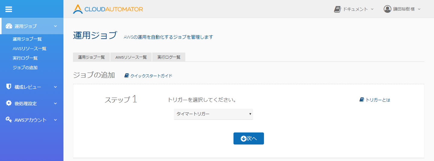 今回は時間が来たらEC2を停止するので、「タイマートリガー」を選択して、「次へ」をクリック。