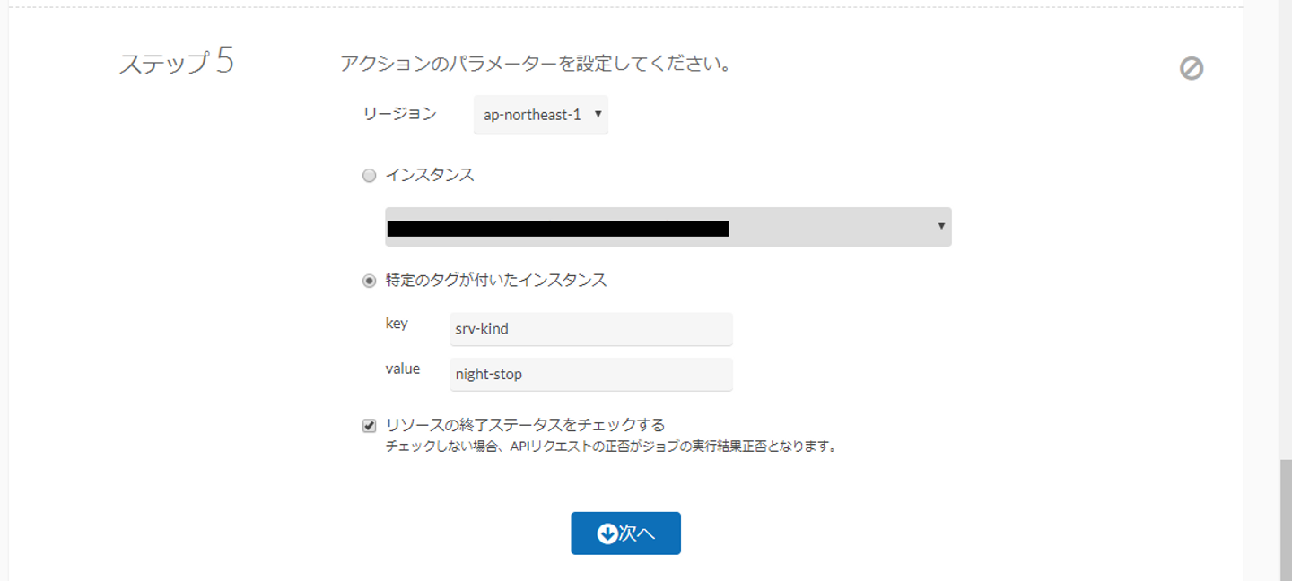 ということで、値を入力しましょう。入力が終わったら、「リソースの終了ステータスをチェックする 」のチェックも入れましょう。入れておくことで、EC2の停止までしっかり見届けて、Cloud Automatorが正常/異常を返してくれます。