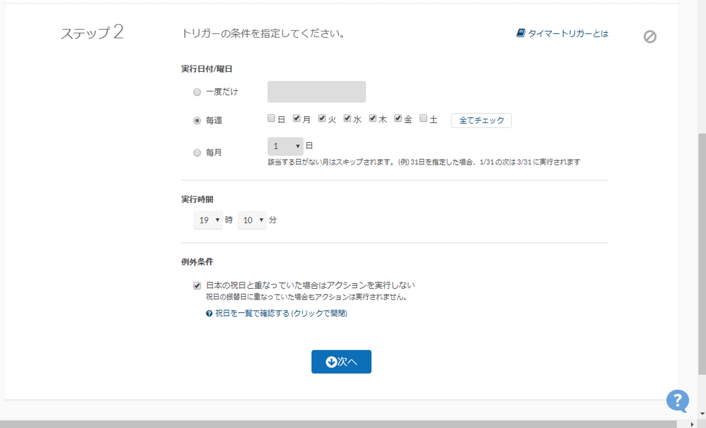 こちらのスクリーンショットは、「平日の19:10」という設定です。祝日はアクションを起こさない設定もできるので、祝日に発動させたくない方は、例外条件のところのチェックボックスをクリックしておきましょう。