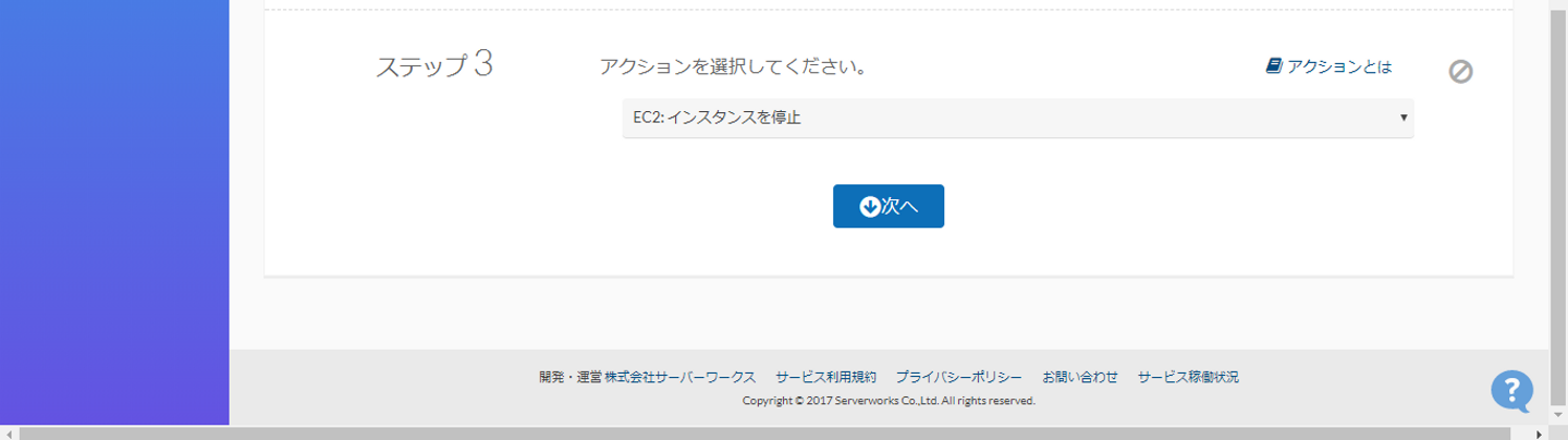 今回はEC2を停止するので、「EC2:インスタンスを停止」を選択して、「次へ」をクリック。