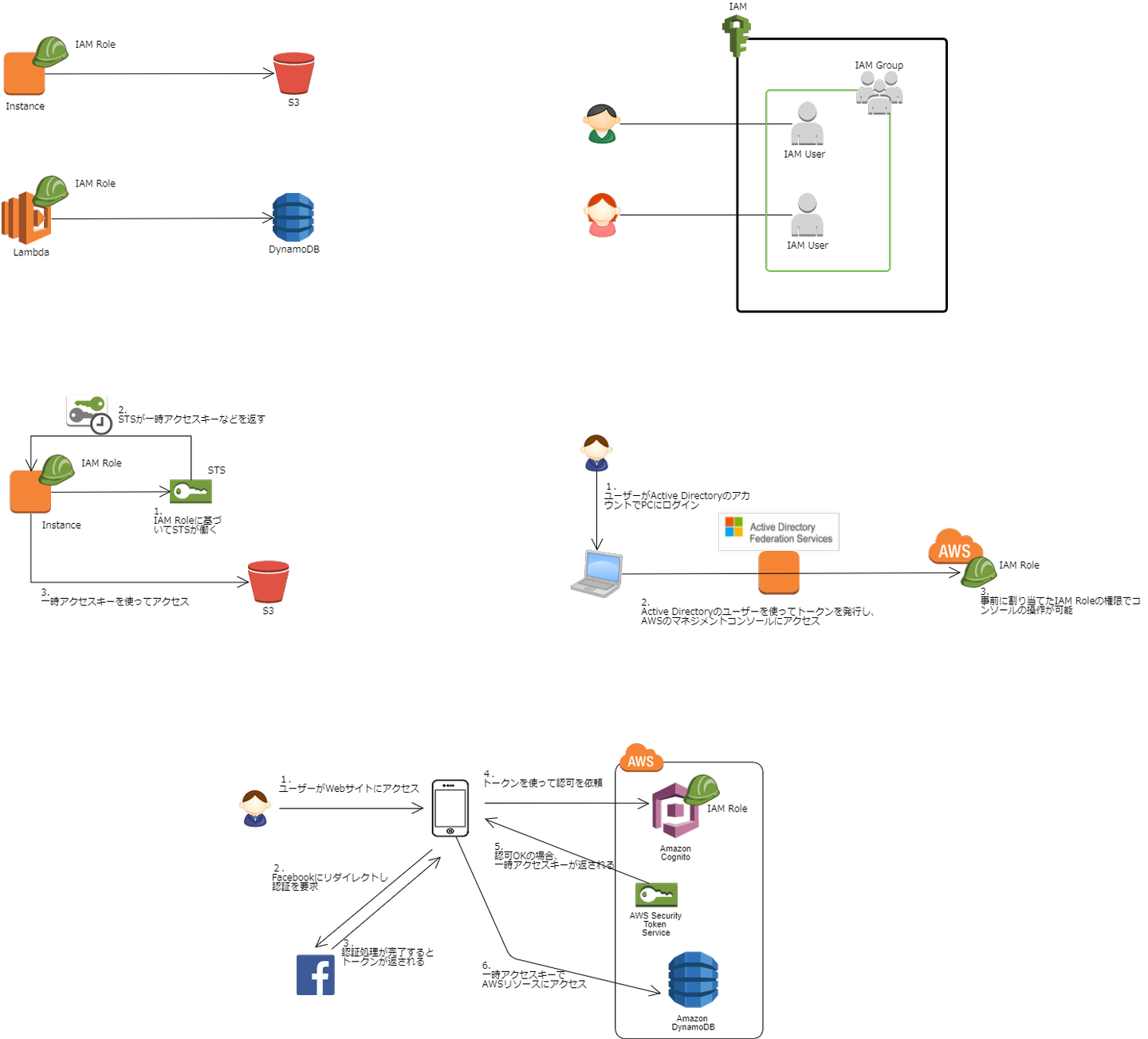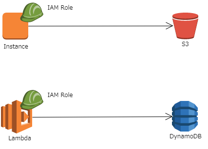 IAM Roleを使う一般的なケースは、EC2インスタンスやLambdaに対してIAM Roleを割り当て、EC2インスタンスやLambdaから、DynamoDB、S3などににアクセスするといった使い方です。