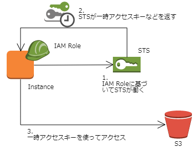 EC2からアクセスすると、EC2のインスタンスメタデータより、割り当てられているIAM Roleの権限に基づいて、Security Token Service(STS)が働き、一時的に利用可能なアクセスキーとシークレットアクセスキー、トークンが払い出されます。