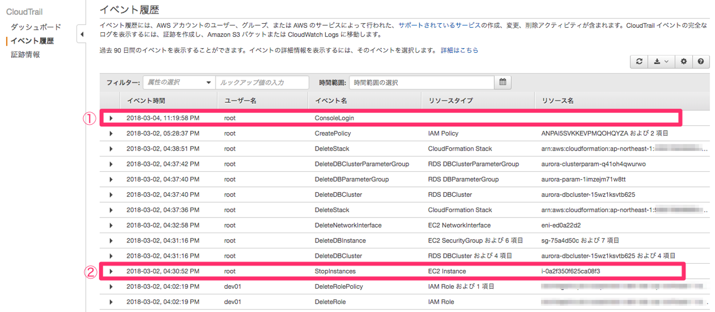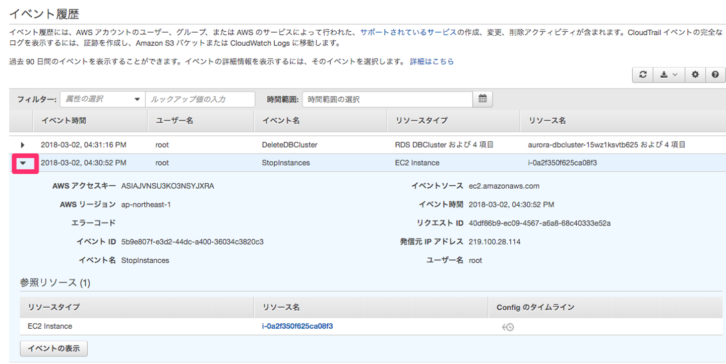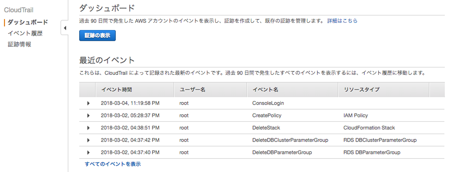 また、「イベント履歴」と「証跡情報」という日本語も違いがわかりにくいと感じました。 とはいえ、監査といった面では大変有効なサービスなので、活用していきたいところです。