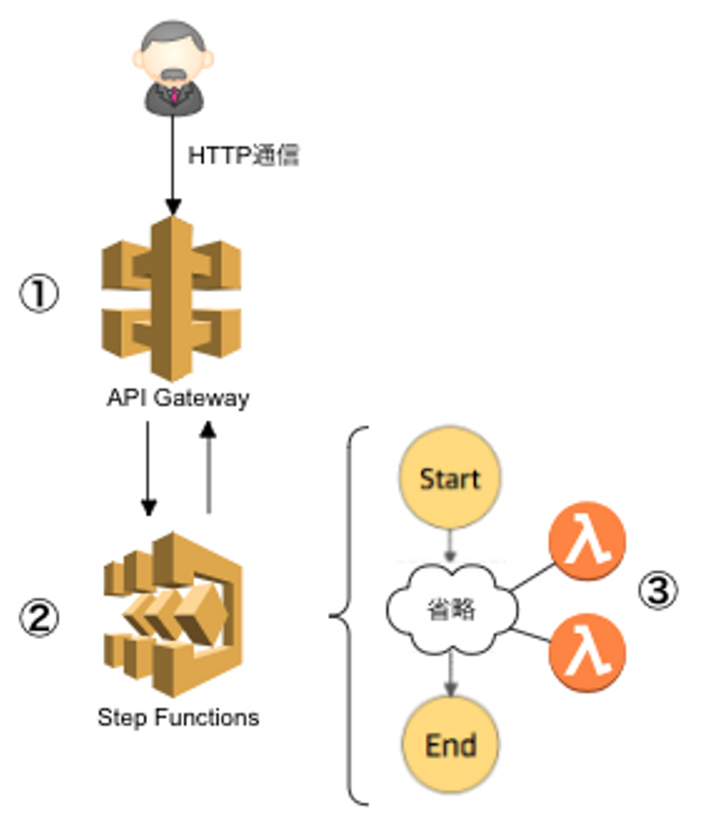 ① HTTPリクエストを受けるAPI Gateway
