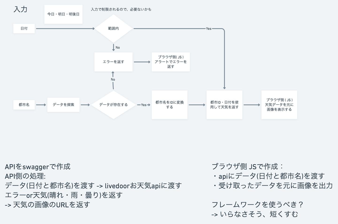どの程度、画面設計に書くべきか迷いましたが、フロントでやろうと思っていることをとりあえず書き出して見ました。ちなみにお天気APIと言っても、天気を収集する方ではなく、天気を収集しているAPIにデータを渡して、レスポンスを整形して返すAPIになります。今回はどれだけ使っても利用が無料の、livedoorお天気APIを使用することにしました。