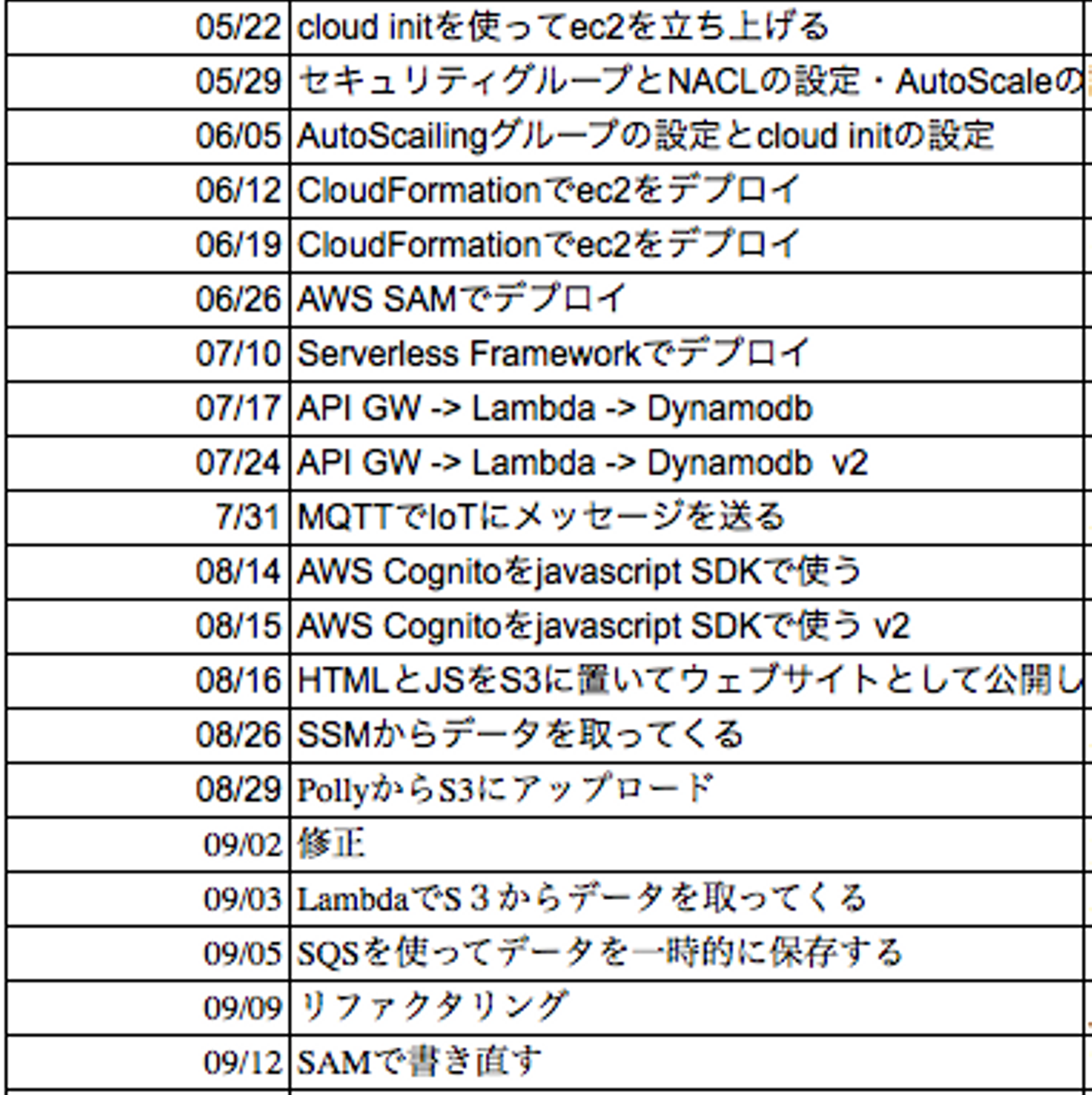 上が今までのインターンで行った内容です。最初の方のEC2のあたりは、自分で使って遊ぶこともあったのでサクサク進んだ覚えがあります。一方SAMやCloudFormationのあたりはかなり苦戦してました。今でも苦手意識はあるんですけど、SAMの値でわからなかったところを、森さんから聞くことができたので、次はもう少し早くできると思います。