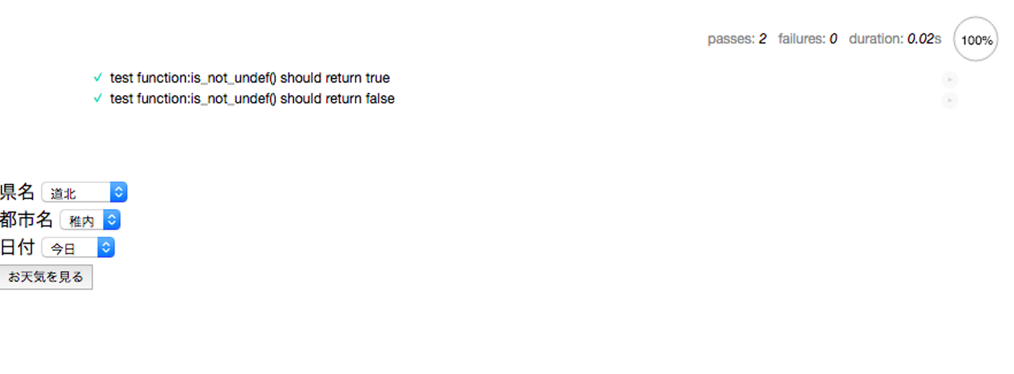 test function: is_not_undef() ~~ と表示されている箇所は、JavaScriptのテストフレームワークの一つである、mochaを利用しました。導入方法は簡単で