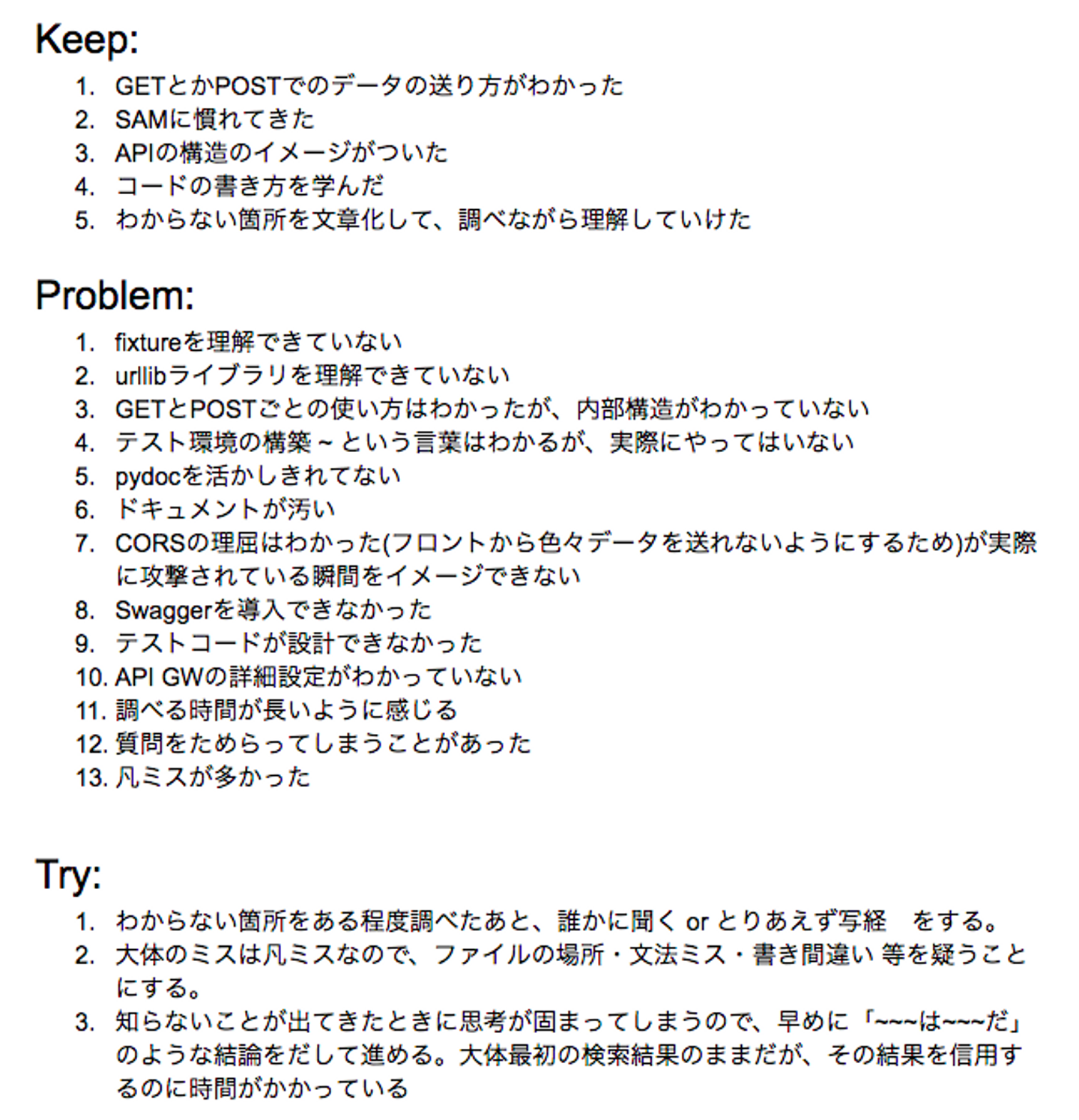 最後に、今回の課題についての振り返りを書きました。後半気づいてきたんですが、大体のミスは凡ミスだなということを感じました。初めて触るサービスだからとか関係なく、文法を確認したり、よくある間違いQ&Aを確認したり、PCを再起動したりという基本的なことを意識して開発ていこうと思います。
