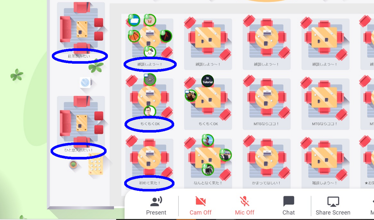 上の写真にバーチャルコラボレーションエリア&リフレッシュルームと表示していますが、これはリアルなオフィスのコラボレーションエリアとリフレッシュルーム(休憩スペース)をオンラインで再現しているという意図です。