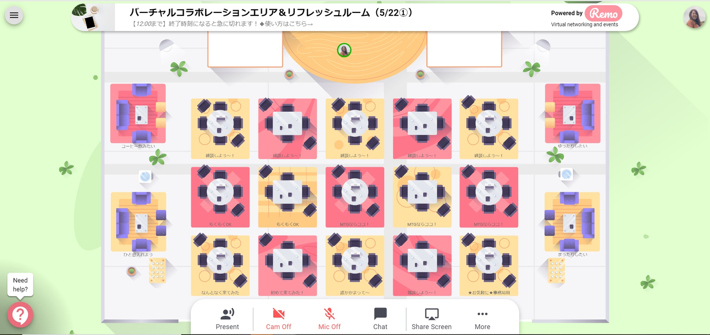 そこで、もともと私の所属する部でオンライン飲み会用に使っていた「Remo」というツールを全社向けにオープンし、雑談や軽いミーティングなどで自由に使ってもらおう!ということになりました。
