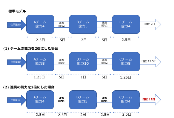 (1)でチームのパフォーマンスを倍にするよりも(それはとても大変なことですが!) (2)の様にチーム間の連携をスムーズにする方が、会社全体のスループットは上がるということを示しています。