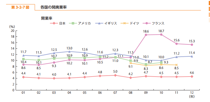 各国での開業率(=起業率)を示すグラフです。