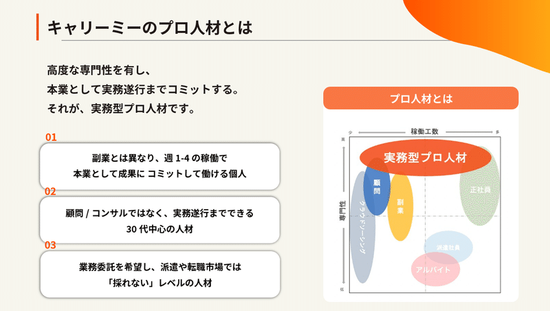 プロ人材の方々にも伝えたいのは、キャリーミーがあえて「フリーランス」ではなく「プロ人材」という言い方にこだわっていることの意図についてです。