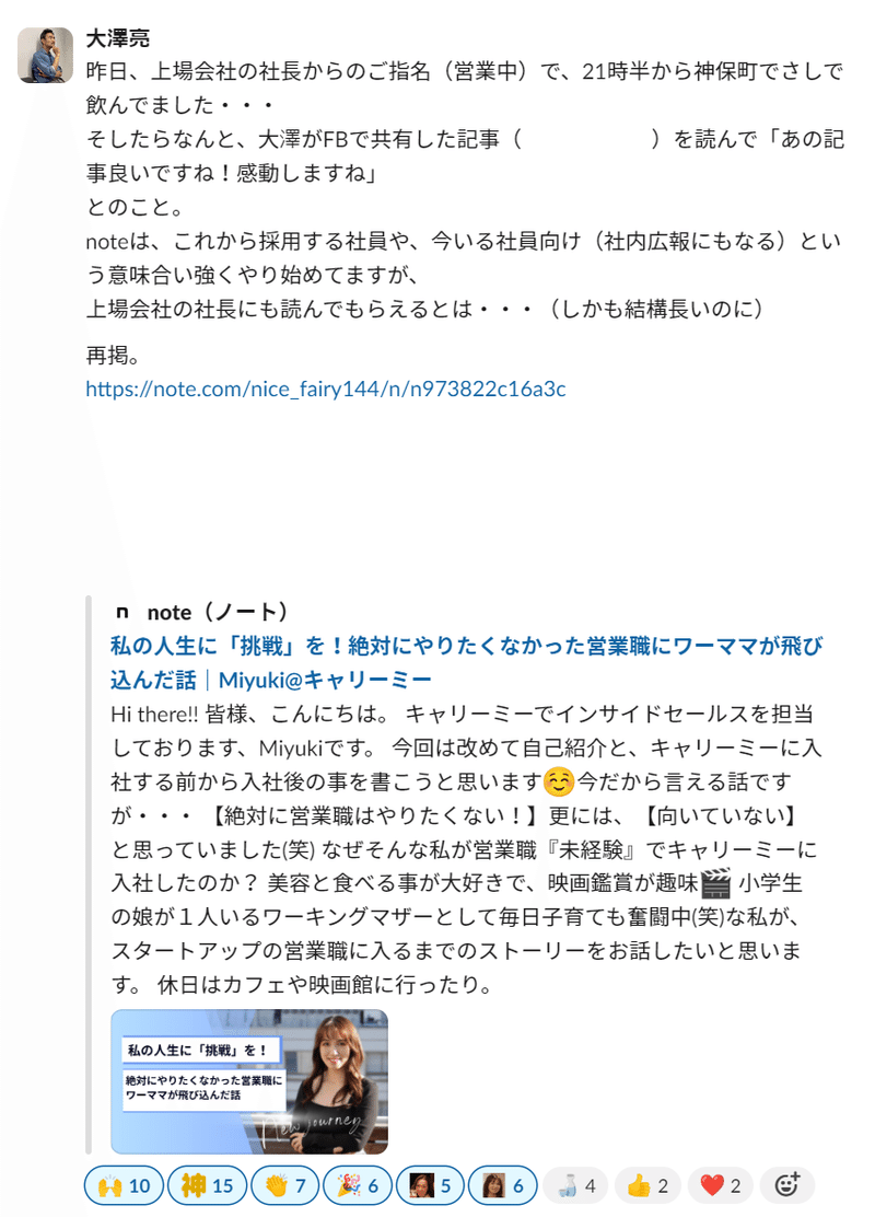 私自身、noteの記事で社員やプロ人材のことをたくさん知ることができましたし、それは社員同士、プロ人材同士でも同様です。