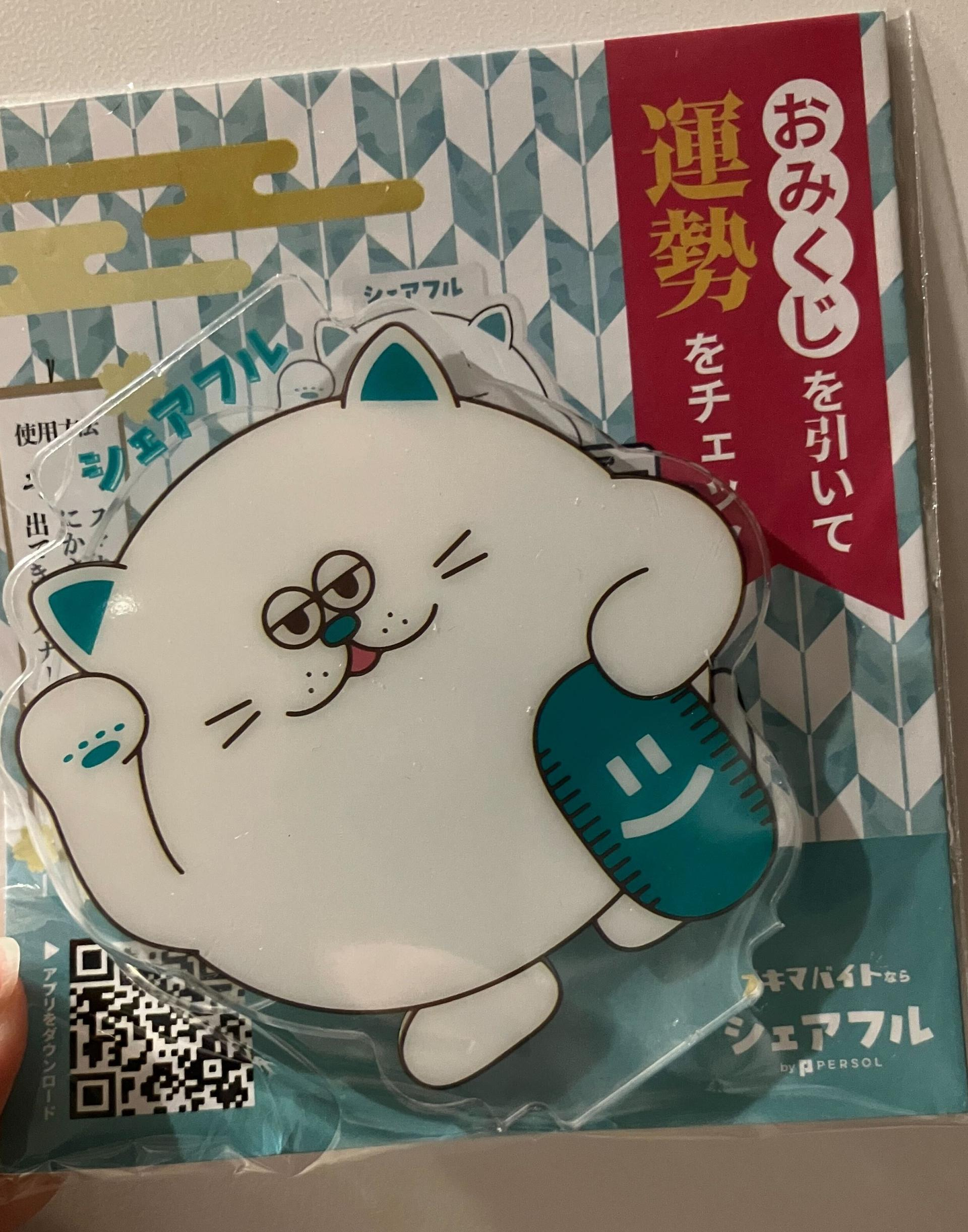 シェアフルの看板キャラクター「すきまろ」のアクリルスタンド。なんとこれ、スマホを近づけるとおみくじが画面上で引けるんです。これで毎日運試しができちゃいます。