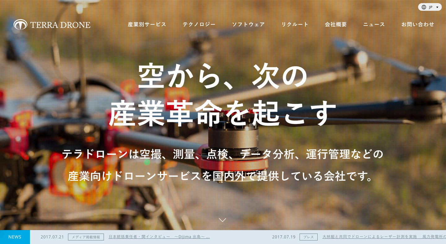 ご存知テラモーターズの子会社として2016年に設立され、多くの大企業とコラボレーションしながらドローンの普及を進めています。土木工事における測量やダムやビルの保守・点検は足場を組んでの目視での確認や高所作業車を利用しての作業など、危険を伴うことも多く、安全確保の意味でもドローンが注目されています。アメリカにはすでにSkycatchという先行サービスがあり、日本からはコマツが出資しています。