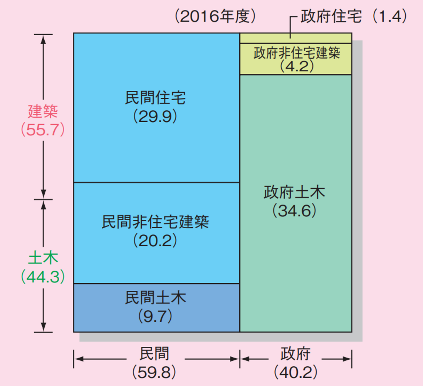 ①建築(建物を建てる工事)と土木(道路やダムなどの工事)は建築がほんのすこし上回る