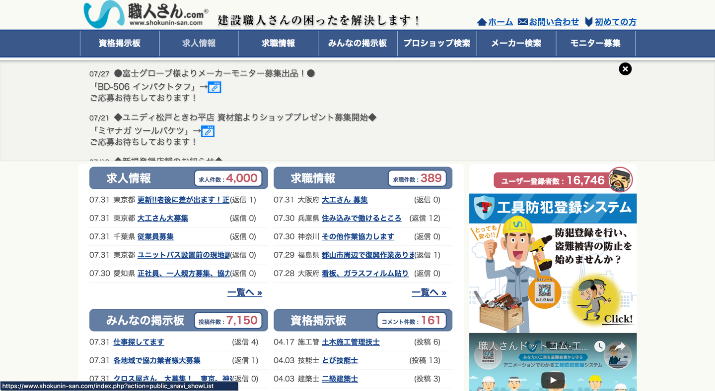 仕事情報の交換に加え、資格ごとの掲示板や現場でネジや部品が足りなくなったときに買えるお店や現場近くの駐車場を探せたり、高価な工具を防犯登録できたりなど「職人の痒いところに手が届く」をモットーに様々なサービスが提供されています。事実、私も職人の方々から「駐車場やホームセンターを探すのが大変」という声は何度も聞いたことがあり、非常に現場に寄り添ったサービスだと思います。