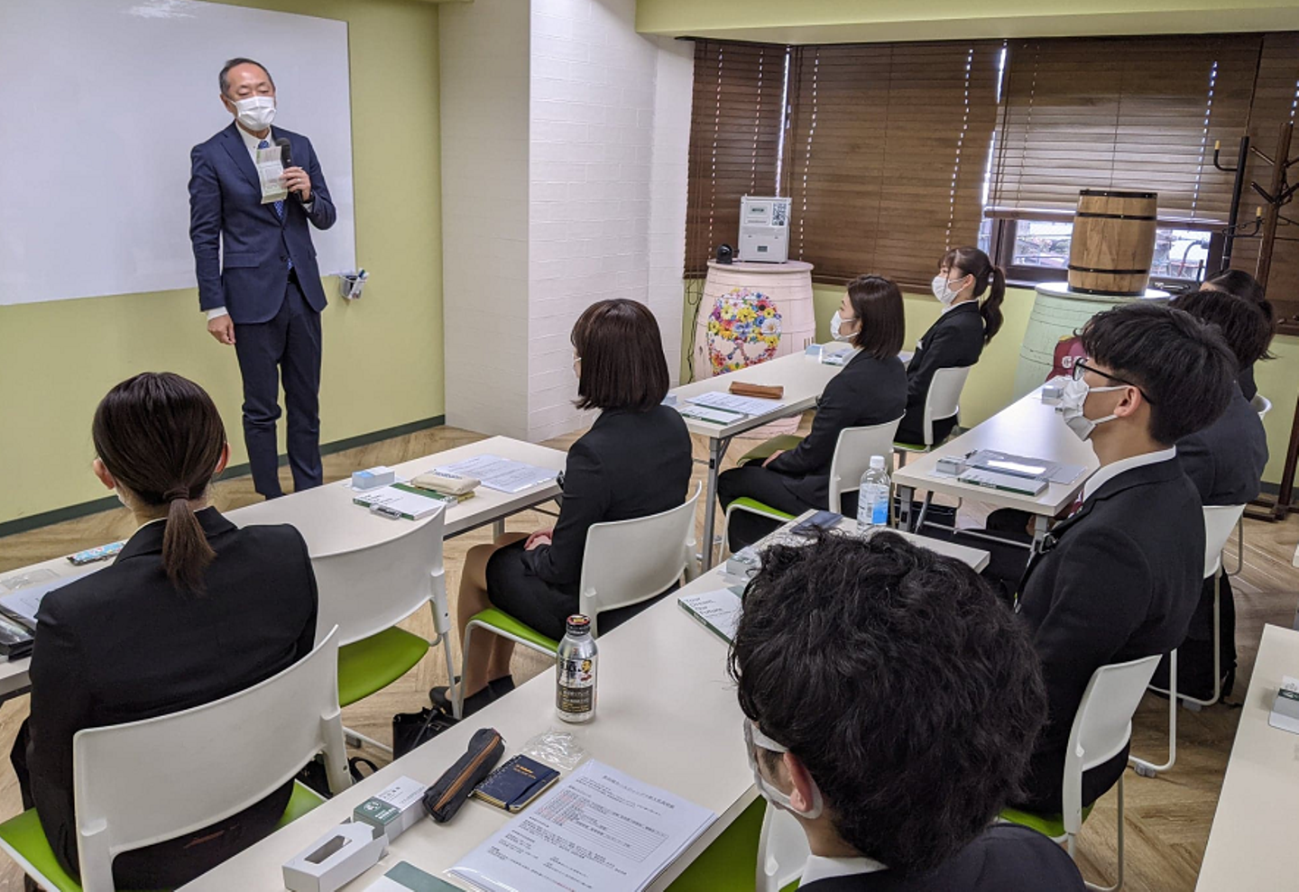 弊社の入社式は式の後に懇親会を行うのが恒例です。今回は感染対策を十分に考慮した上でということで、例年とは違ったお弁当スタイル(飲食部門の先輩社員によるお手製)になりましたが、柴田屋らしく皆さんを迎え入れることができたと思います。