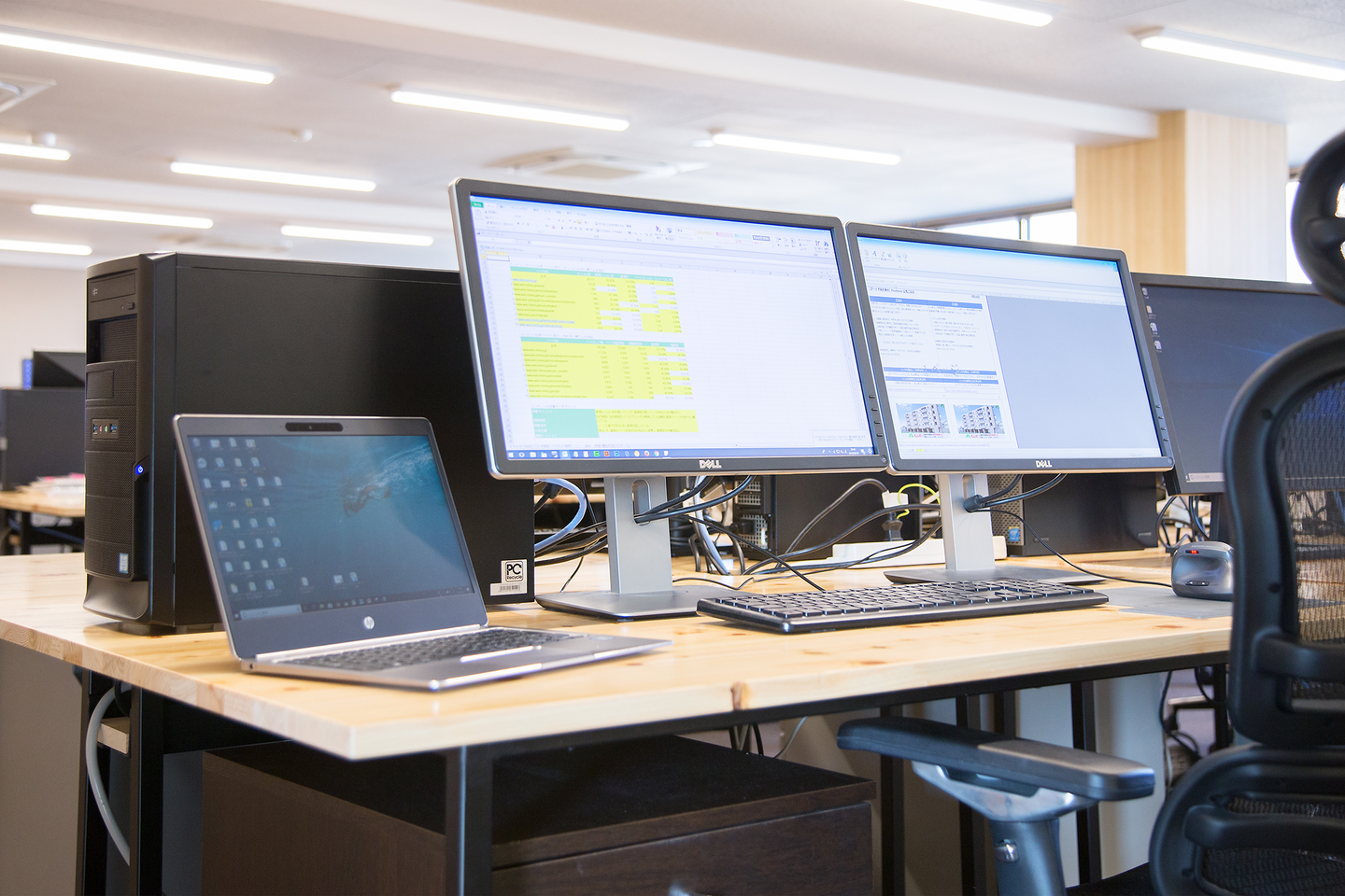 全員がデュアルモニタ、エルゴヒューマンのイスを使用し、体に負担のかかりにくい環境、仕事に集中できる環境を目指しています。