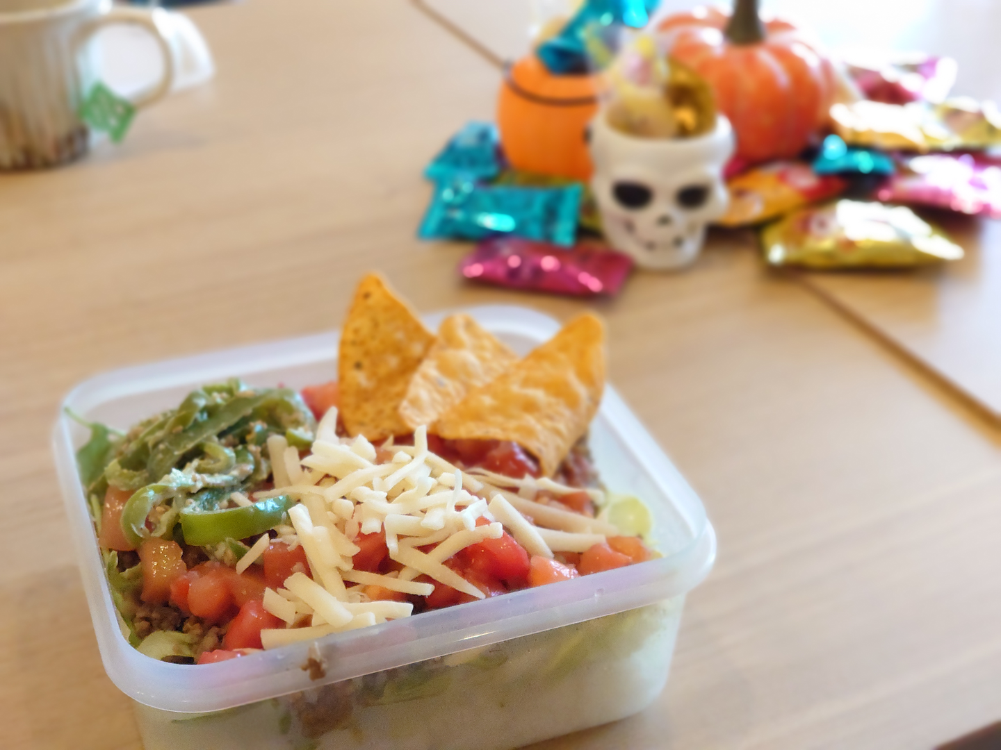 持参のご飯に、レタス・カレー味のお肉・トマトソース・チーズ…と順番に盛り付けて…