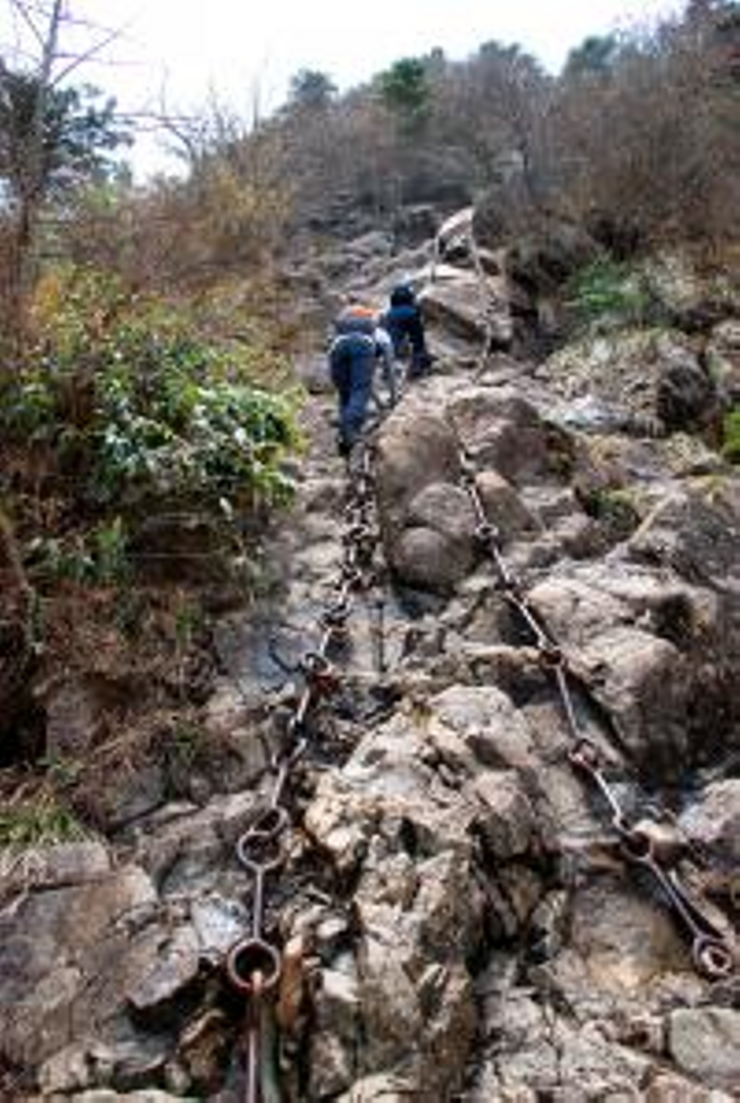 石鎚山には全国的にも珍しい「鎖場」というものがあり、鎖を握りしめながら急斜面…というかもはや崖を登るという…