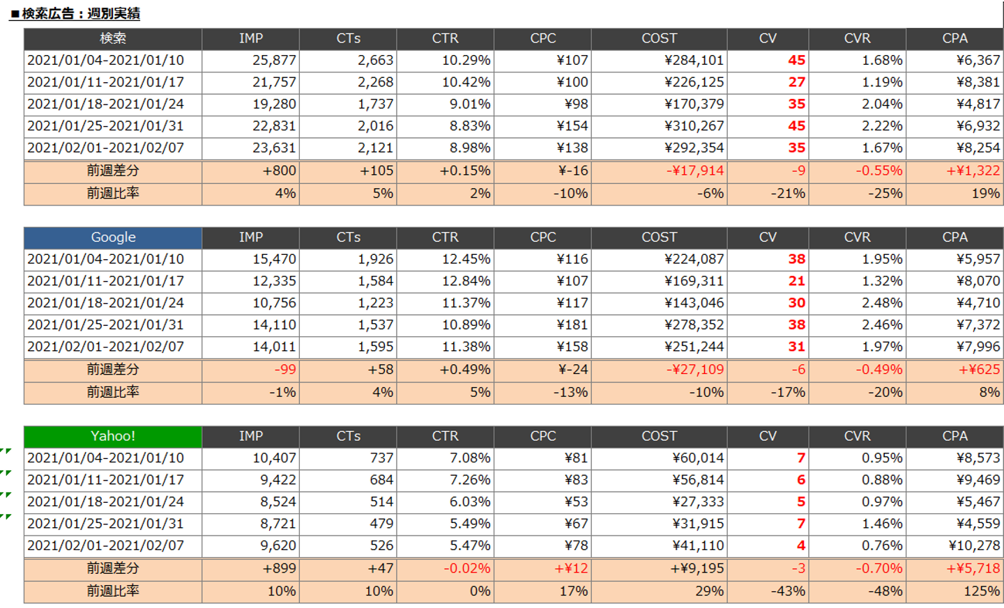 このレポートには、IMP=インプレッション(広告が表示された回数)や、CV=コンバージョン(広告配信によって得られた広告主が求める成果)が記載されています。こちらを元に、先週と比較して今週の実績はどうだったか、この数値になった要因は何かを紐解いていきます。