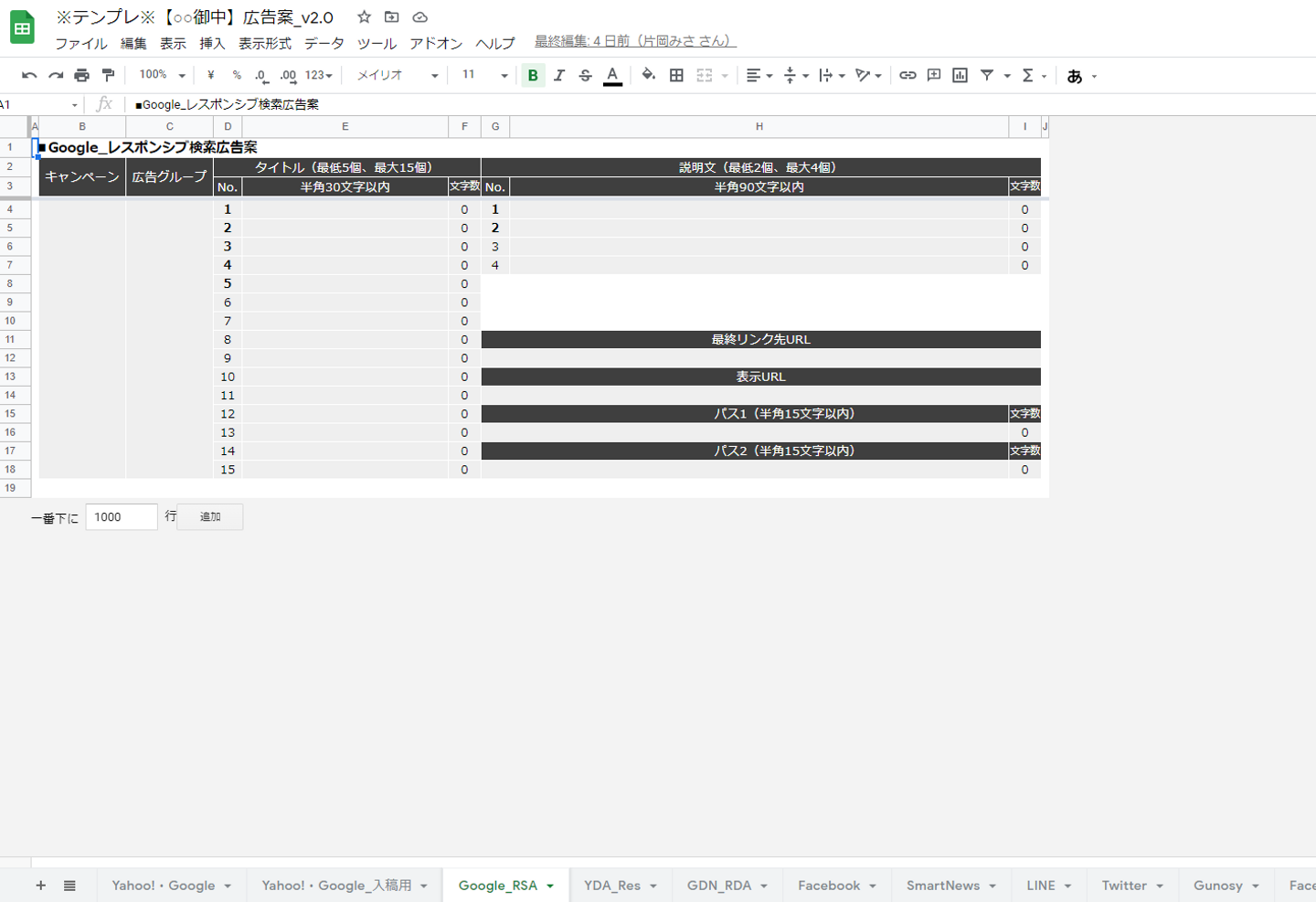 ▼資料例(各媒体の広告案のテンプレート)【スプレッドシート】