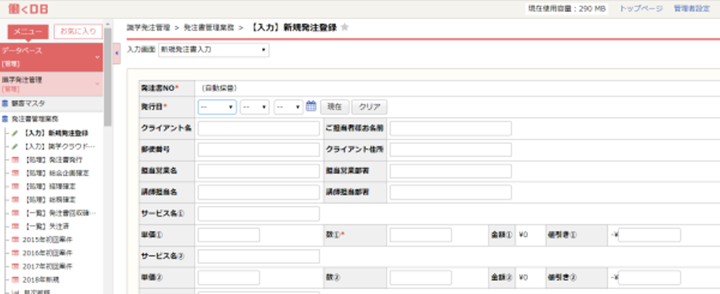 成約後、営業が「働くDB」に必要情報を入力することで発注書が完成。発注書を回収後、バックオフィスが「働くDB」上に追加の情報を入力するだけで顧客のデータベースが完成 ➡他部門の情報をそれぞれが一度に把握できるため、ヒアリングにかかる時間が大幅に削減。多くの人が関わることによる入力ミス、漏れなどのヒューマンエラーも削減