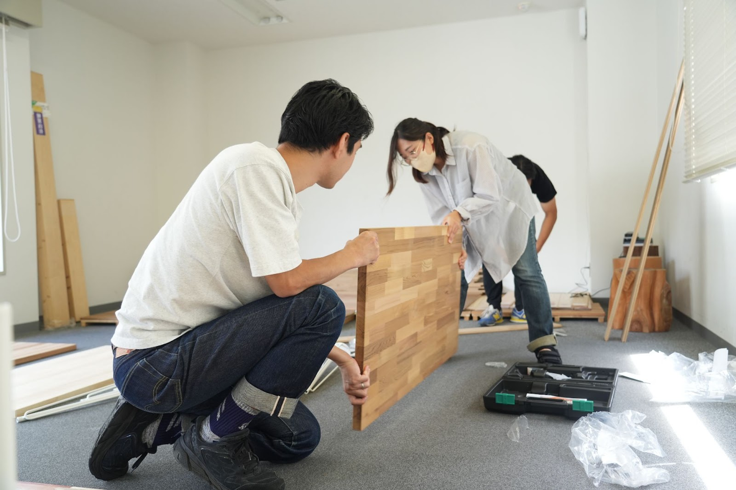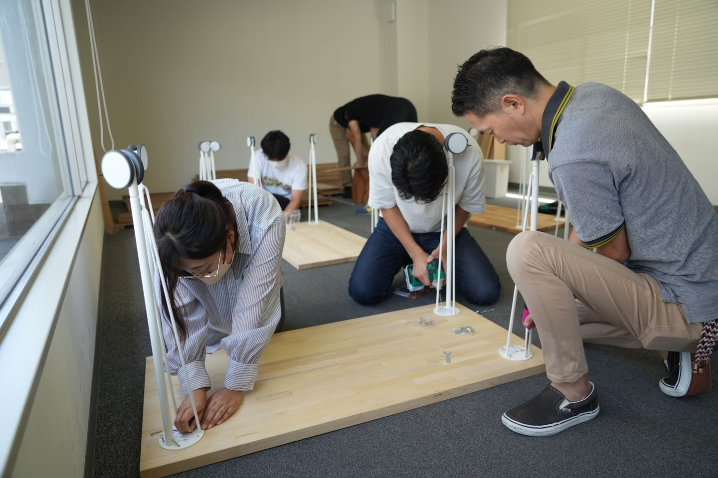 そこには、ちょっと特別な光景が広がっていました。メンバーたちが木の香りに包まれながら、デスクづくりに取り組んでいます。作業はシンプルで、あらかじめ指定サイズに加工された天板に、インパクトドライバーで脚を取り付けるだけ。