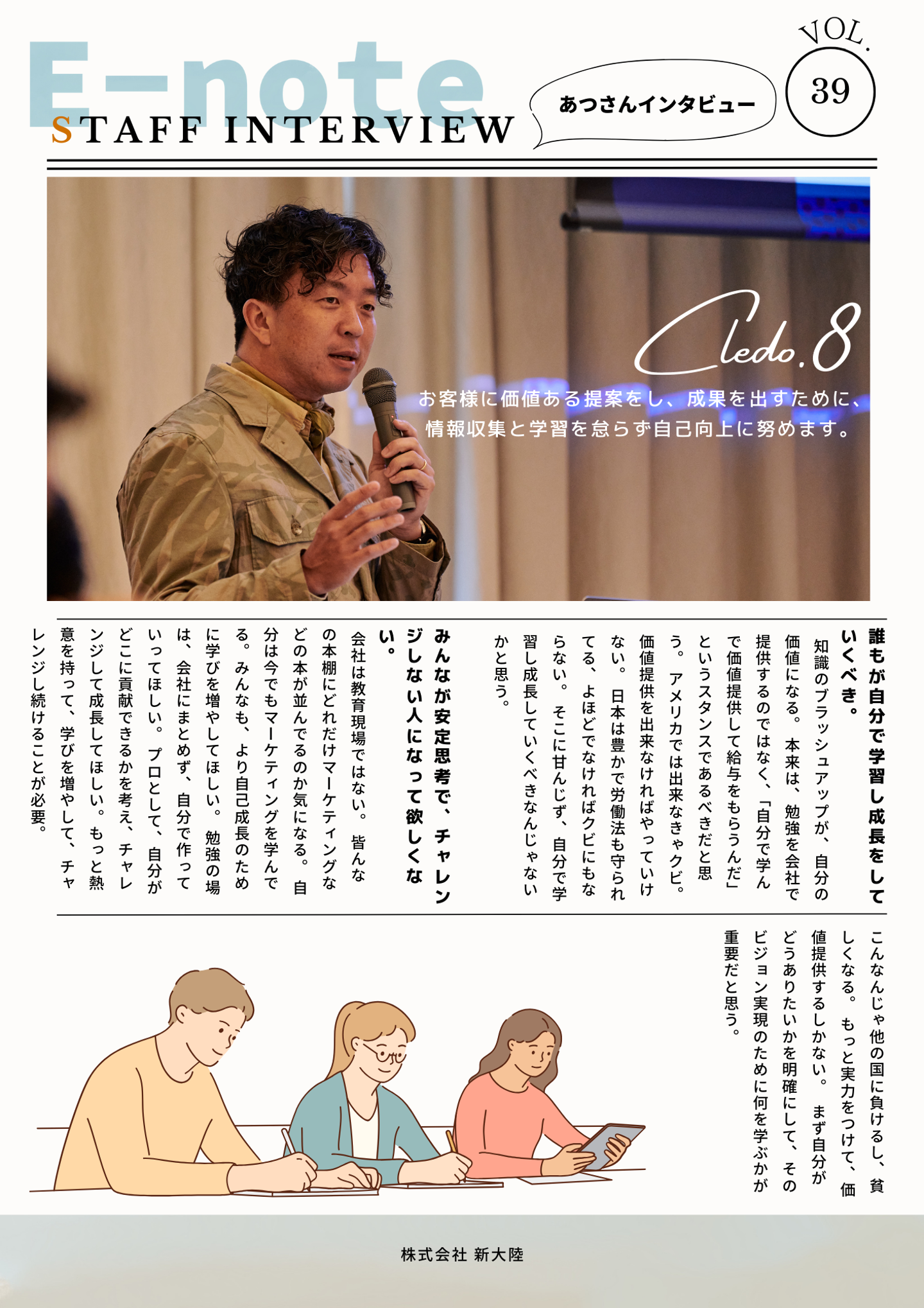 新大陸ではE-noteという社内報を発行し、クレドやコアバリューに関するエピソード、インタビューを全員で共有し、文化醸成を図っています。