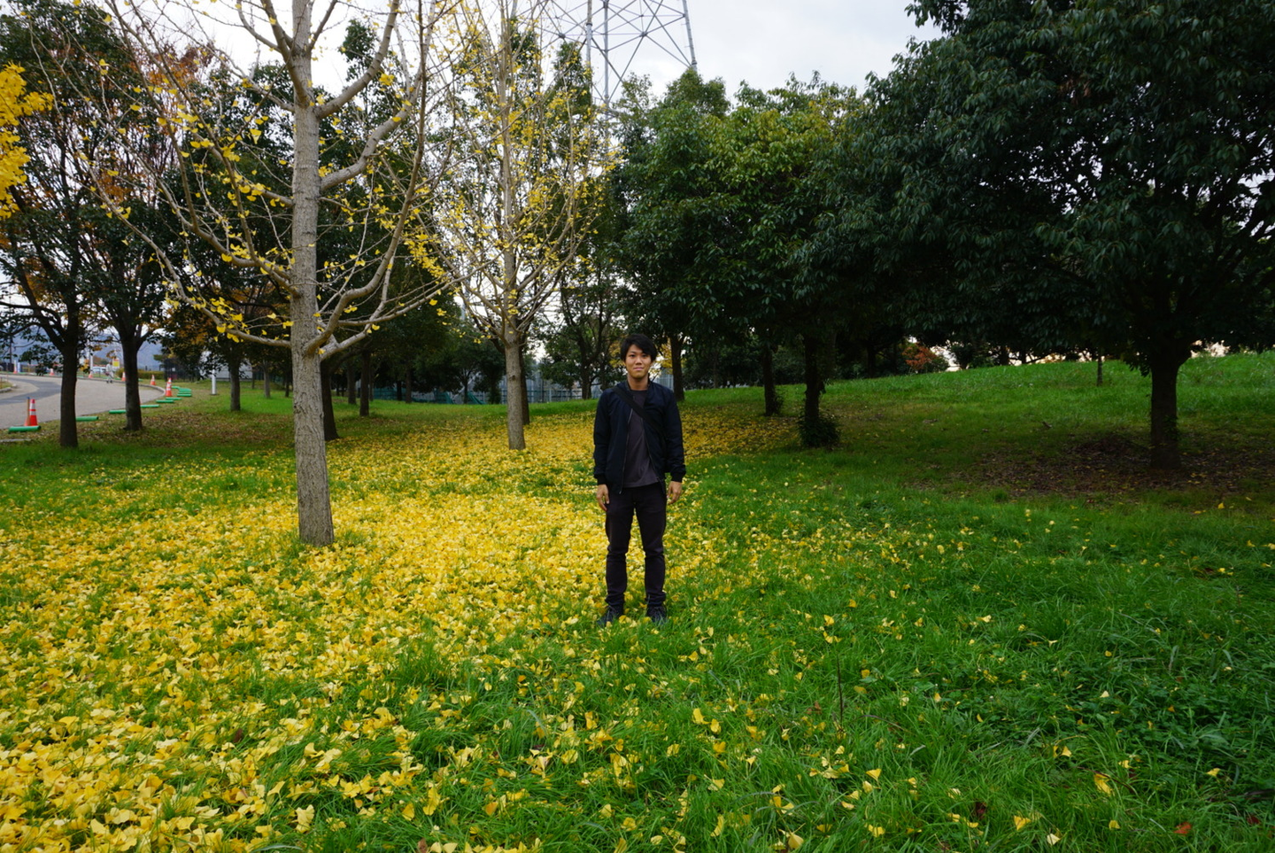 イチョウの木を全力で揺すって、もみじの絨毯を作った時の写真です