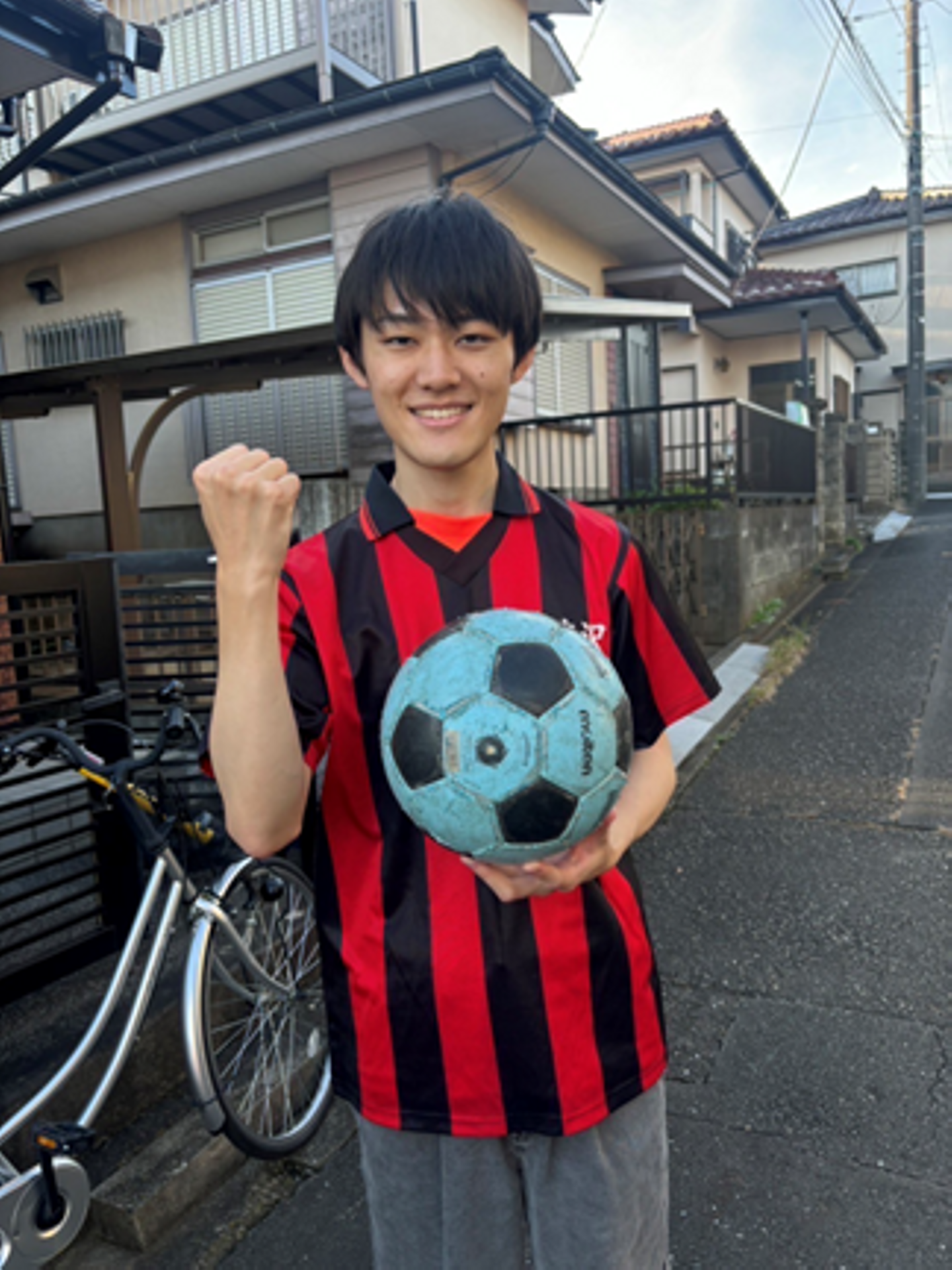 この写真は家の前で中学校の頃のサッカー部のユニフォームを着たスワくんです!