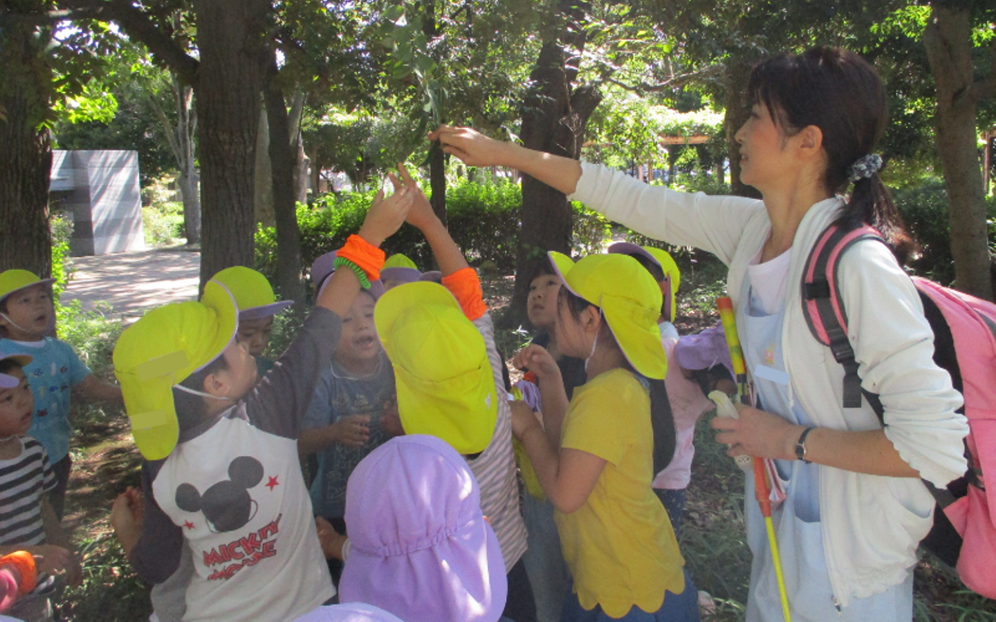 新幹線が園庭の大木のすぐ脇を走り抜けます。2階の大きなウッドテラスに出て、小鳥と大木と新幹線の空気を感じることのできる空間は心が落ち着きます。職員たちみんなの仲が良く、チーム力があるなぁと感じることのできる職場も大好きです。