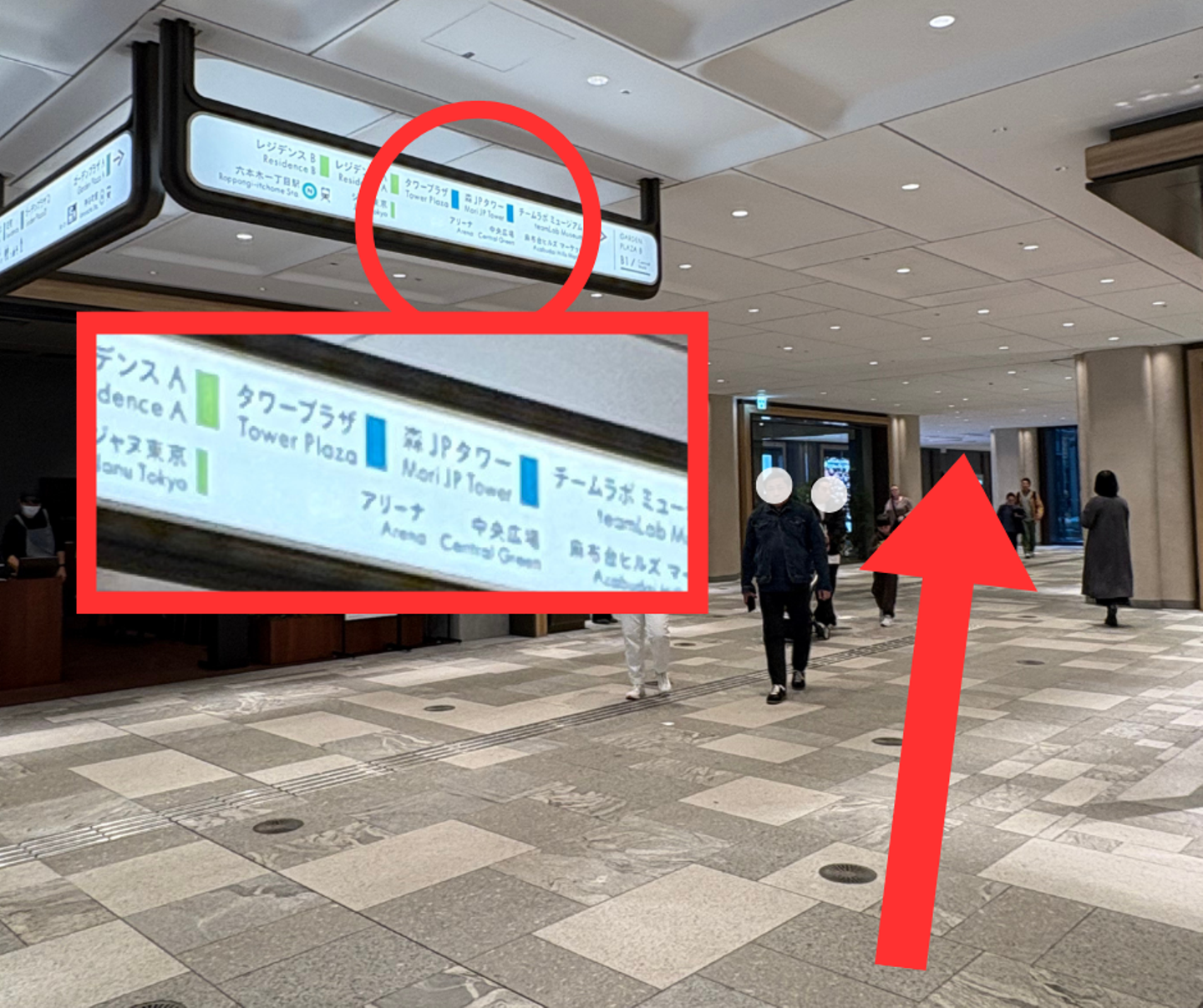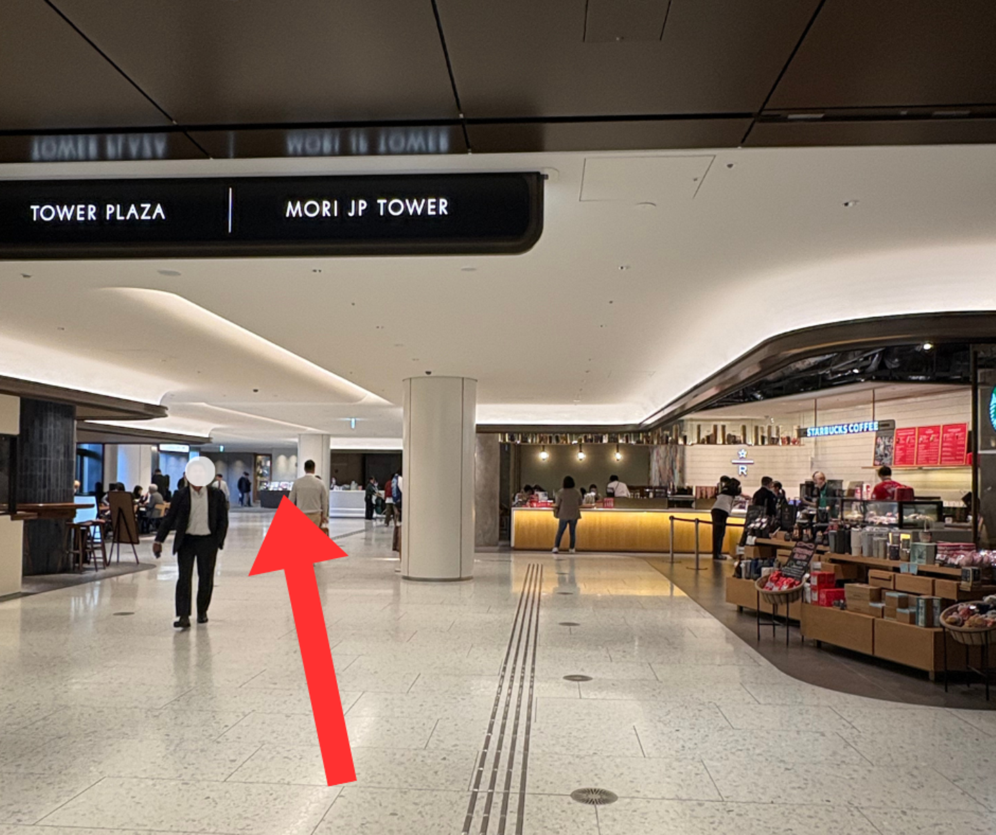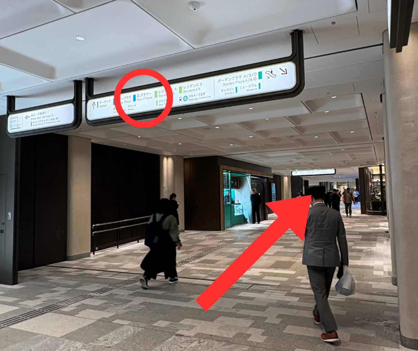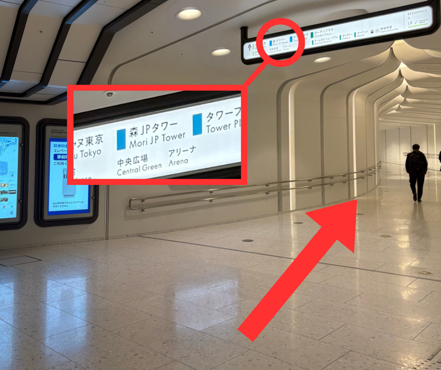 ⑧エスカレーターを上がったら「MORI JP TOWER」の表示が見える通路に出るので、そこを歩きます