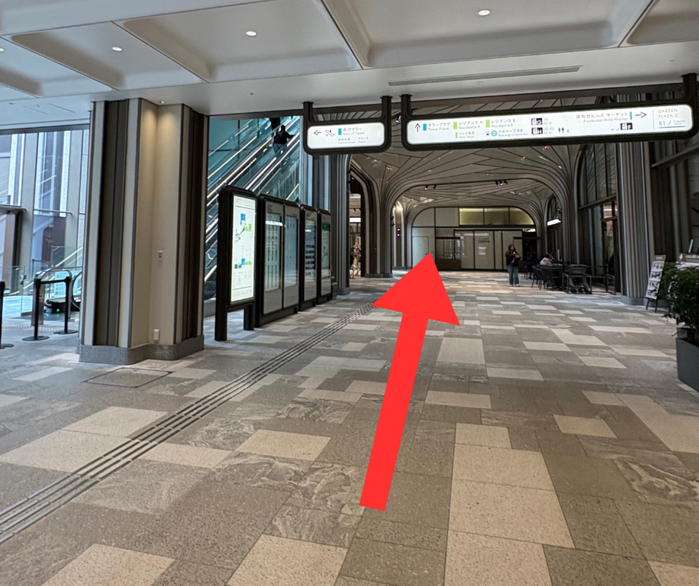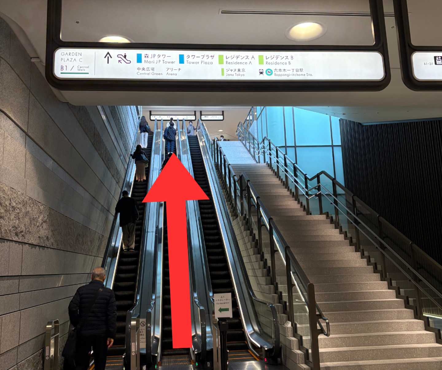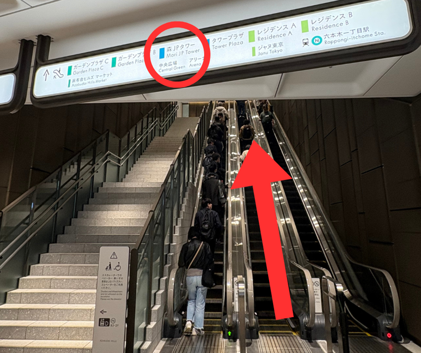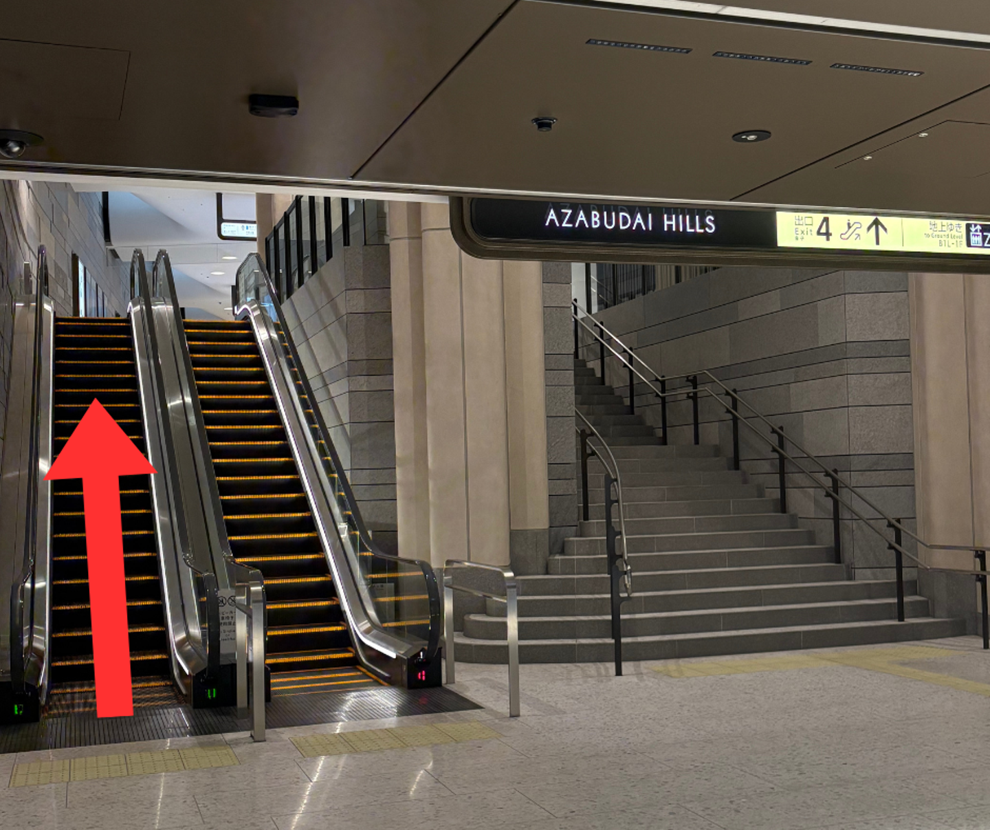 ②「AZABUDAI HILLS」の文字が見えたらエスカレーターを上がります