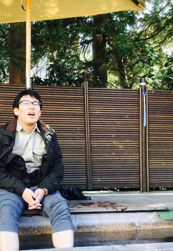 ▼社員旅行で足湯を発見、リラックスモードの松井さん( ˶˙࿁˙˵ )ᐝ