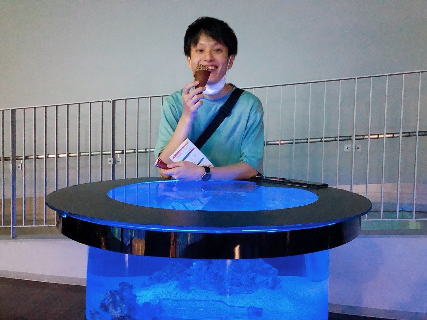 水族館へ行って、にっこり笑顔の徳田さんでしめたいと思います!アイス(・∀・)オイシイ!!