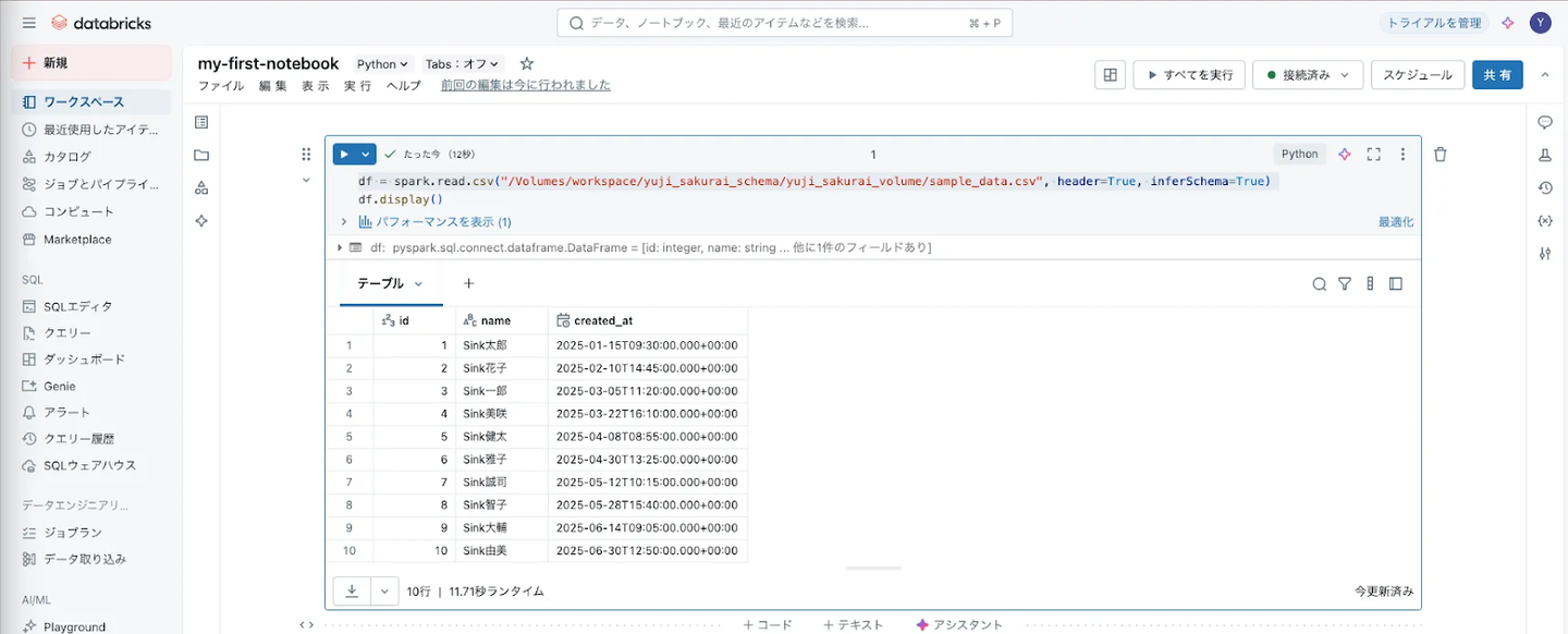 ① ワークスペース内でノートブックを作成し、Pythonベースの環境でSQLを実行する。
