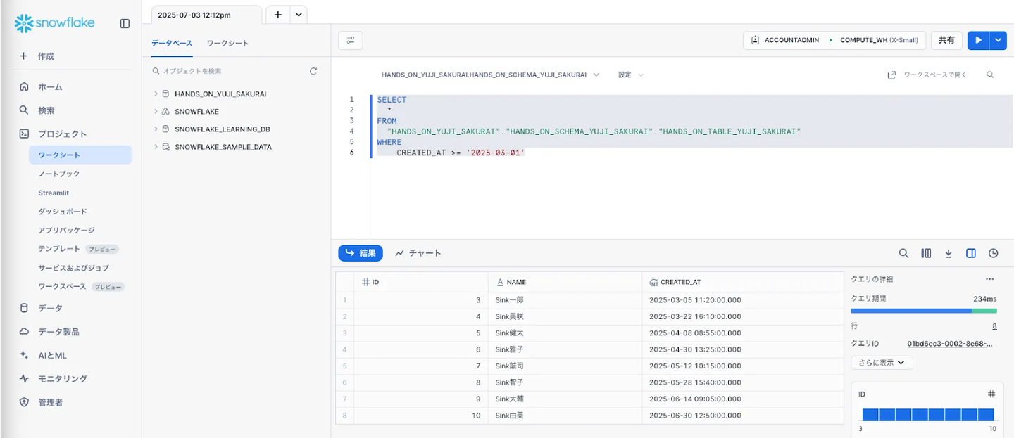 ② SQLワークシートでSQLクエリを実行し、データを操作する。