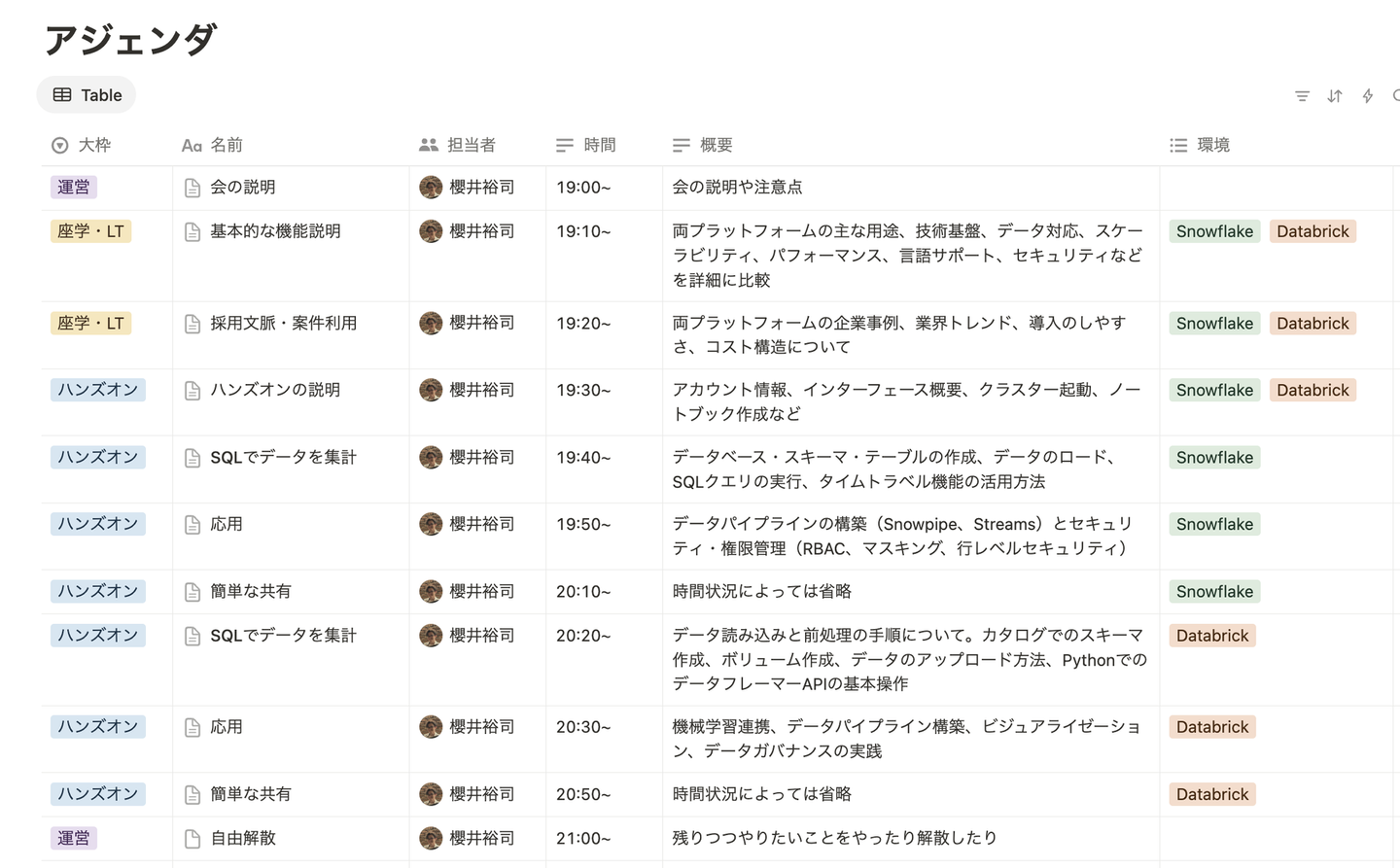 SQLやデータ分析ツールの経験があるメンバー向けに、SnowflakeやDatabricksを学べる場として用意しました。参加者が実際にそれぞれのサービスに触れ、その特徴や活用方法を理解することで、明日からの実務に活かせる第一歩となることを目的としております。