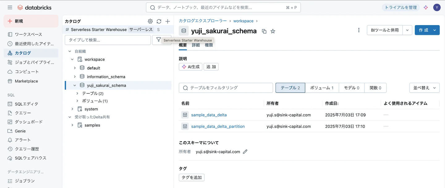 ② カタログ、スキーマの概念に触れ、データレイクハウスの構造を把握する。