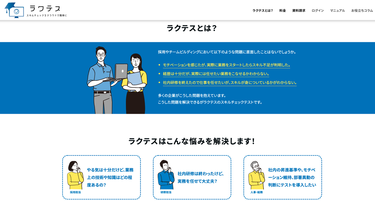 このシステムは当初、自社のオンラインテストの実施のためだけに作ったものでしたが、この仕組みを他の企業にも提供することで、人材と仕事のミスマッチを解消できるのではないかと考えました。そこでサービス化したのがラクテスです。ラクテスは、誰でもかんたんに独自のオンラインテストを作って運用できるSaaSです。