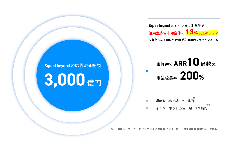 弊社は Squad beyond(スクワッド ビヨンド) というSaaS型デジタル広告(Web広告)運用のプラットフォームを運営しており、年間3,000億円以上の広告に利用されています。