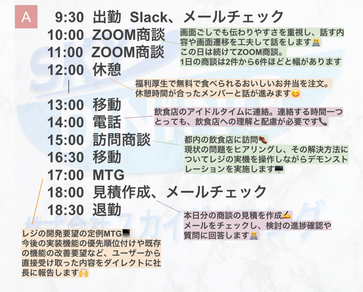 株式会社カインズで販売員(商品管理・発注)、店舗人事(サービスカウンター、採用・教育)などを経験した後、2022年に株式会社スカイダイニングへ中途入社しました。レジの設置講習、顧客対応など経て、現在は営業部に所属しています。